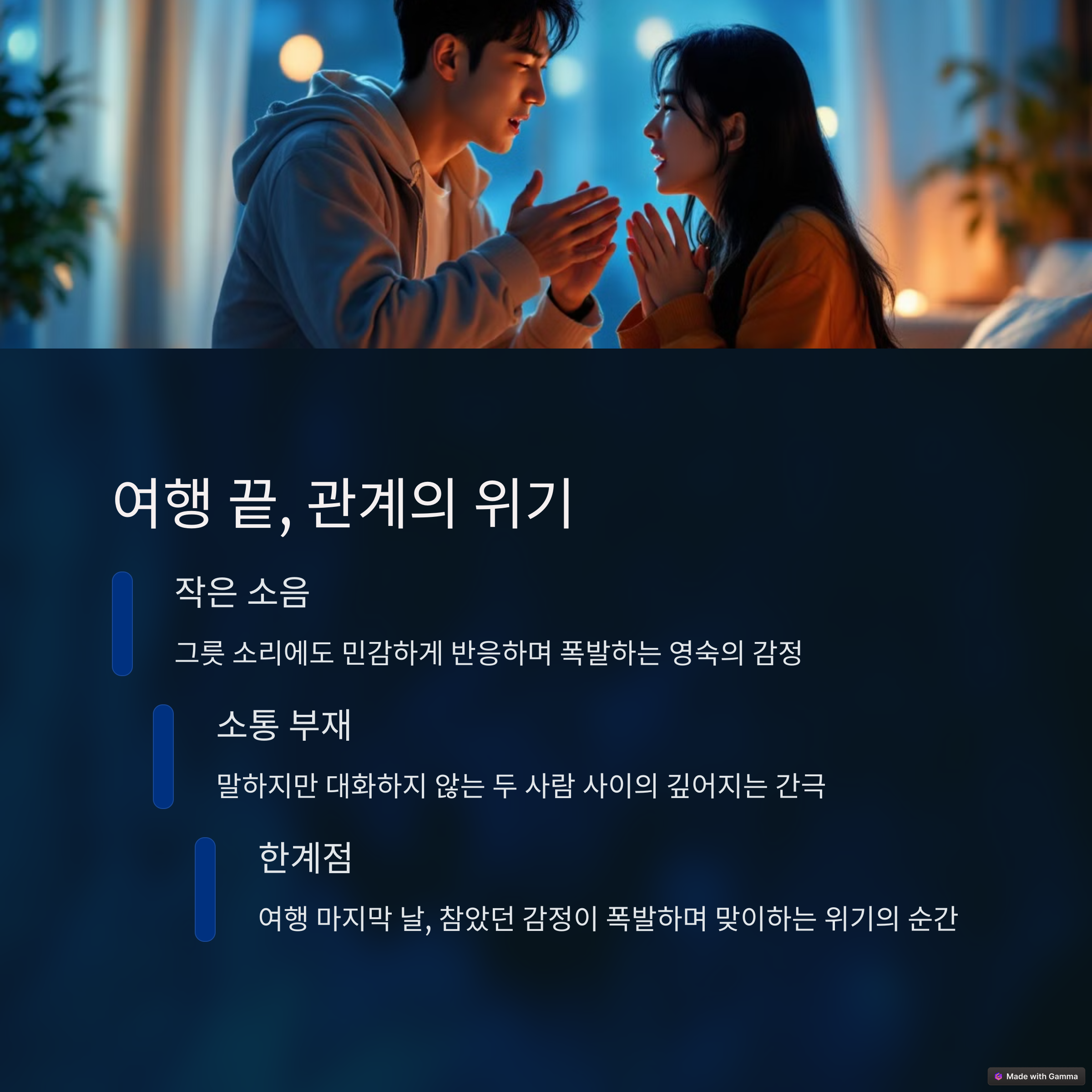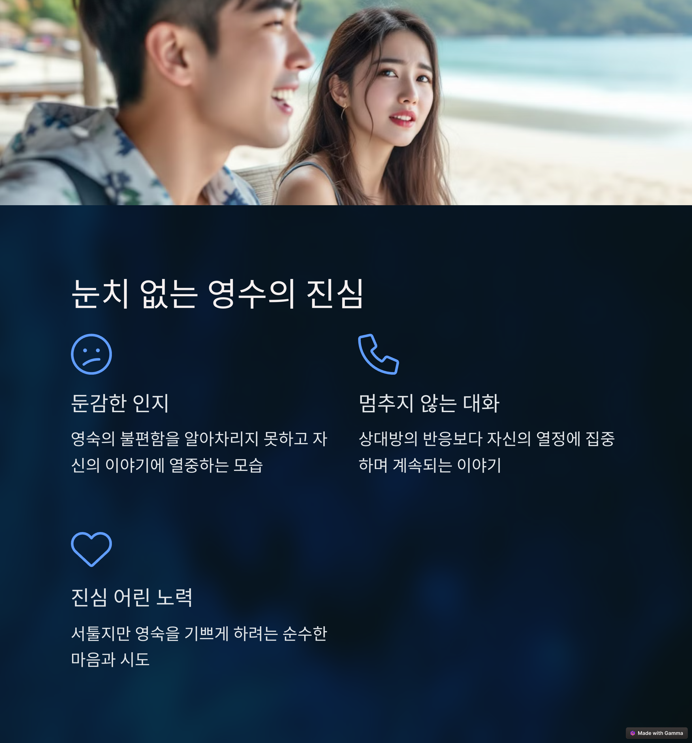 영숙은 영수의 말이 너무 많고 눈치가 부족하다고 생각합니다. 반면, 영수는 영숙이 지나치게 예민하게 반응한다고 느낍니다. 서로 다른 성격과 기대가 맞물리면서 갈등이 커지는 모습을 보여줍니다.