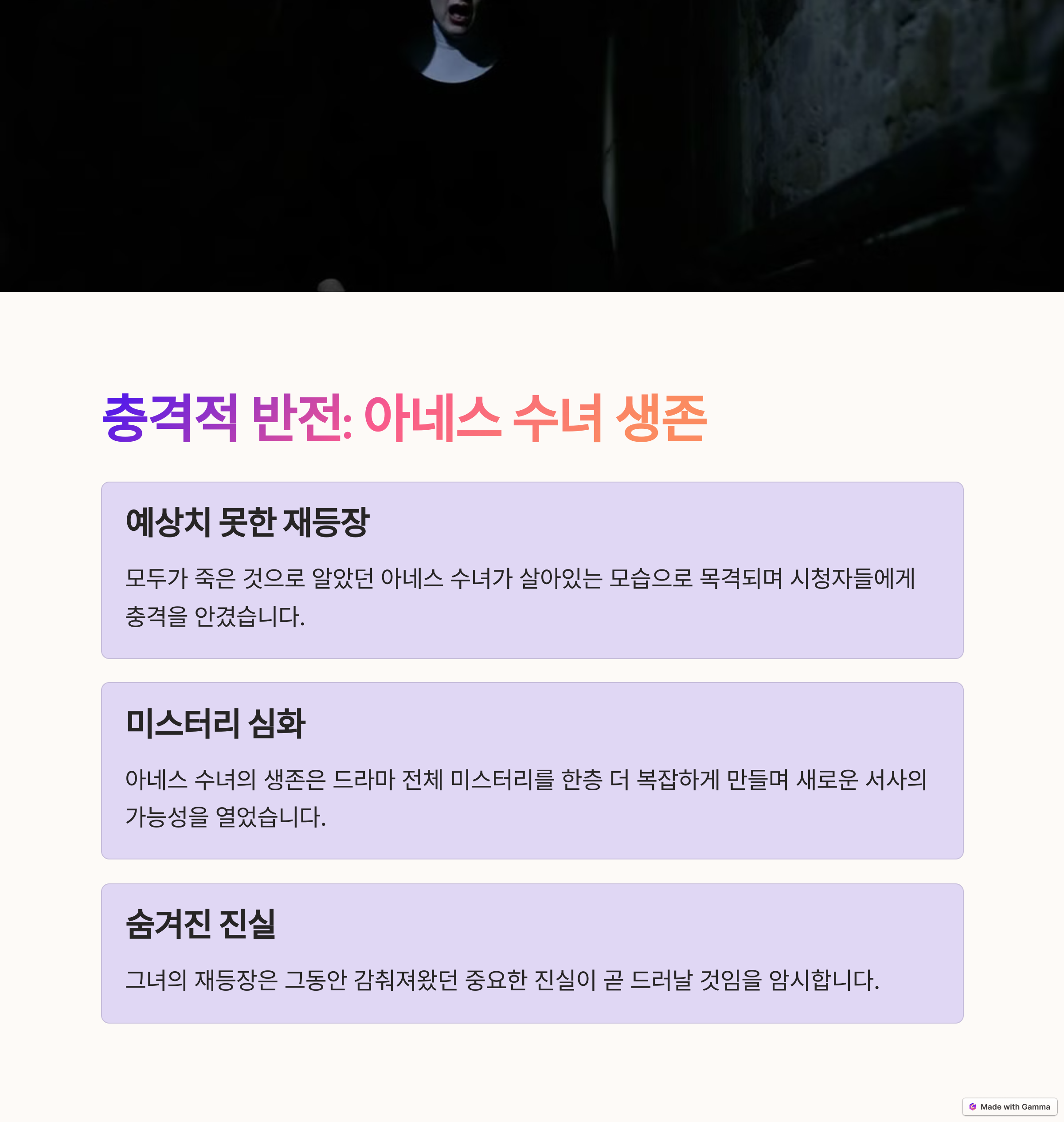 그러나 이번 화에서 충격적인 반전이 등장했습니다. 모두가 죽은 줄로만 알았던 야네스 수녀가 살아 있는 모습으로 목격된 것입니다. 이는 시청자들에게 큰 충격을 안겨주었으며, 드라마의 긴장감을 더욱 극대화했습니다. 도대체 그녀는 어떻게 살아남았으며, 이 모든 사건과 어떤 연관이 있는 걸까요?