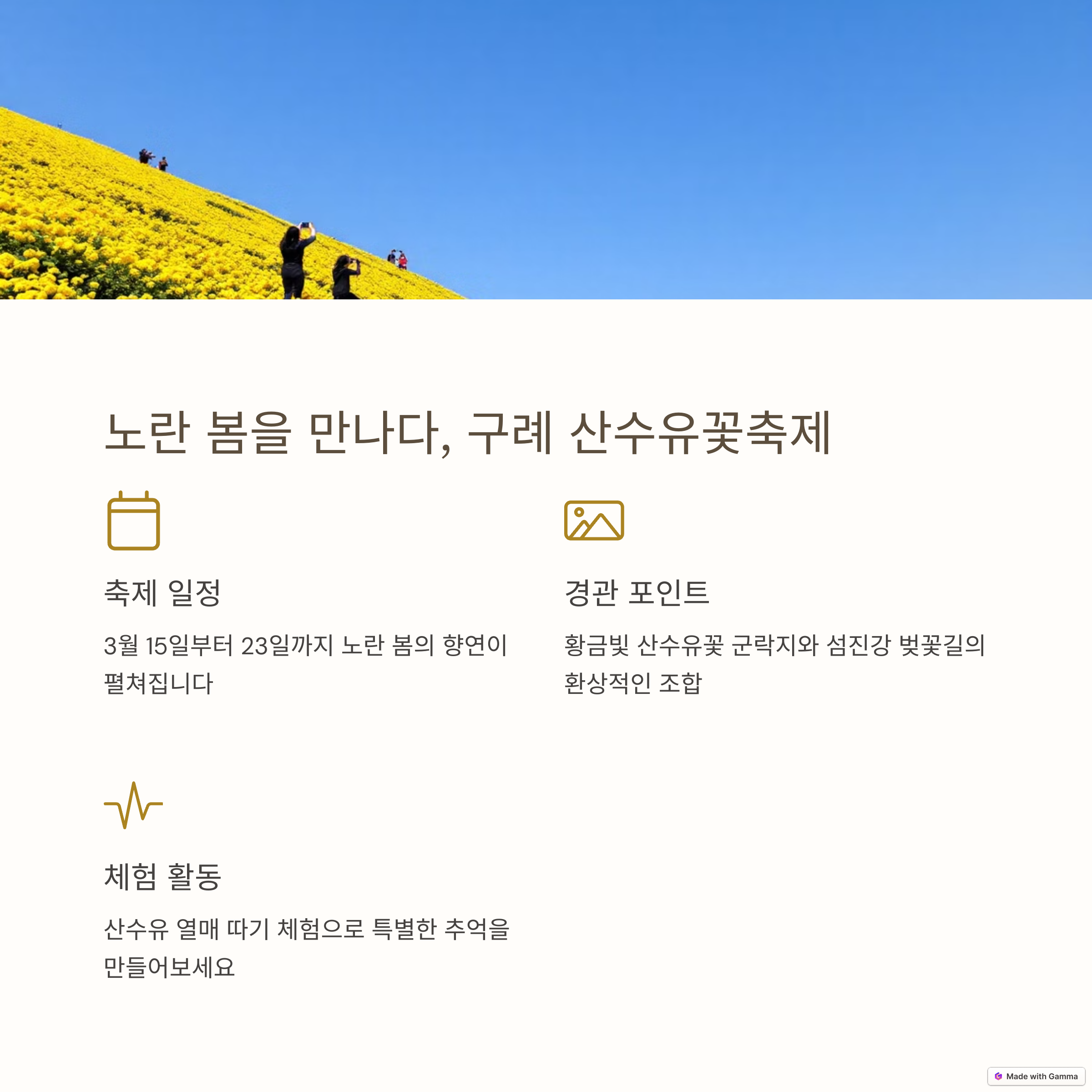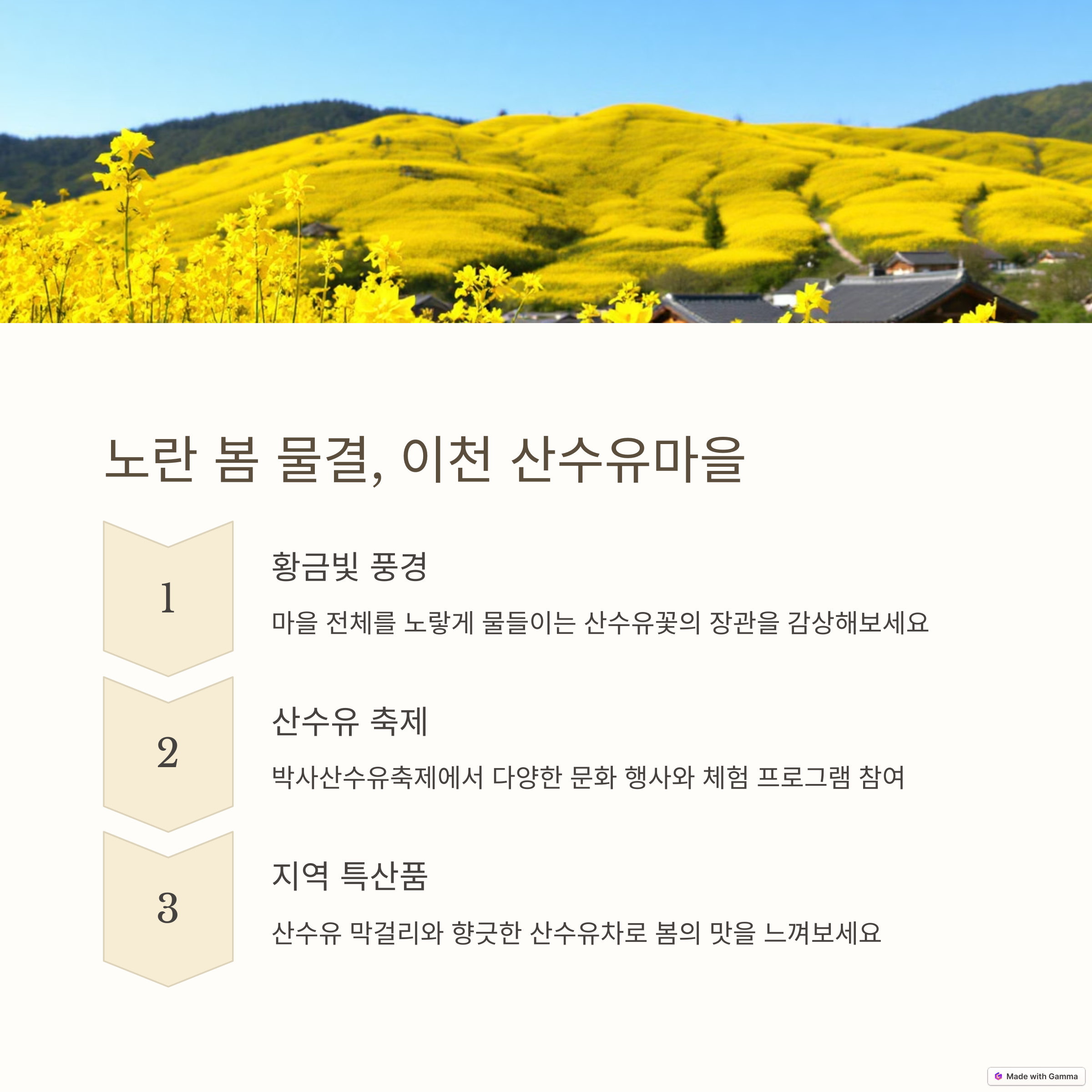 서울 여의도 윤중로는 도심 속 벚꽃 명소로, 한강변을 따라 벚꽃을 감상하며 여유롭게 산책할 수 있는 곳입니다. 또한, 경기도 이천의 산수유마을에서는 노란 산수유꽃이 만개하는 아름다운 풍경을 볼 수 있으며, 매년 박사산수유축제가 열려 다양한 체험 프로그램도 즐길 수 있습니다.