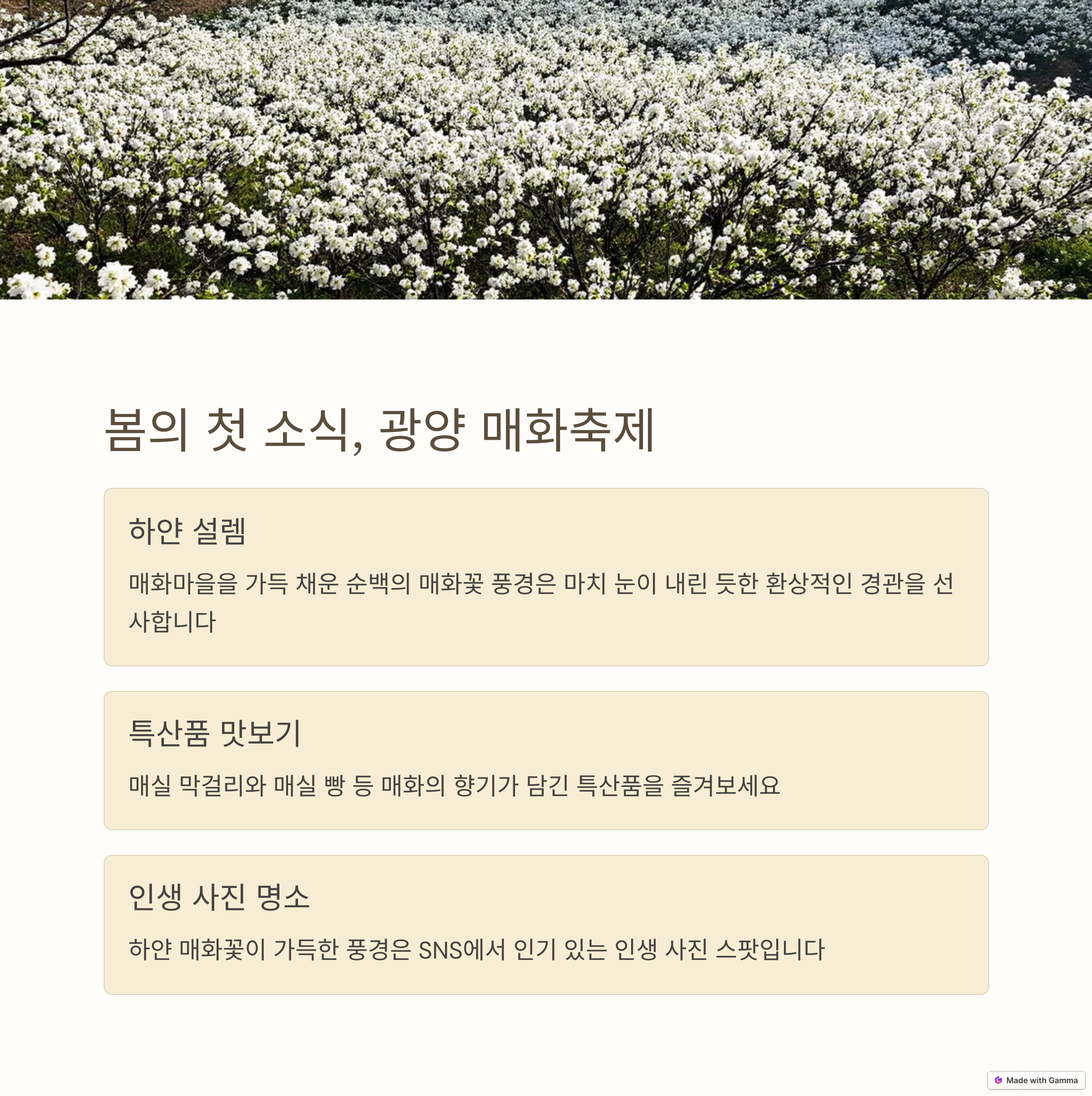 | 광양 매화축제 | 은은한 매화향과 따뜻한 분위기 | 3월 중순 |