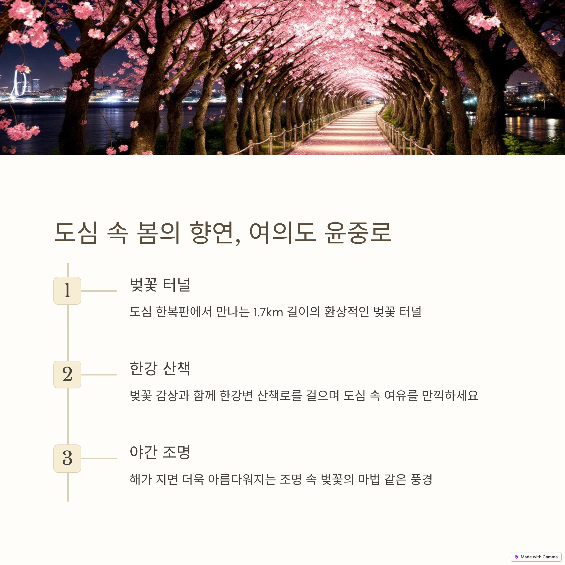 | 여의도 윤중로 | 도심에서 즐기는 벚꽃 산책로 | 3월 말 ~ 4월 초 |