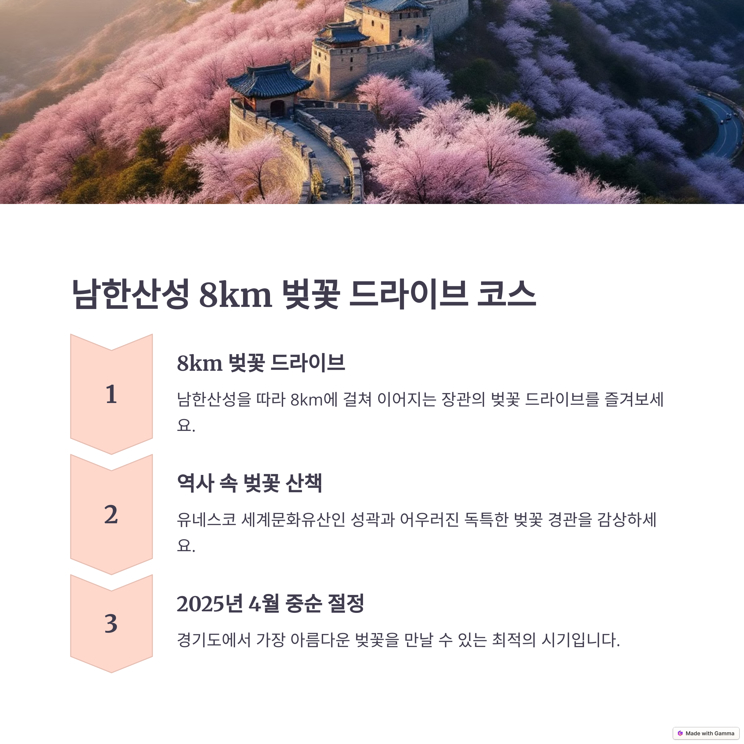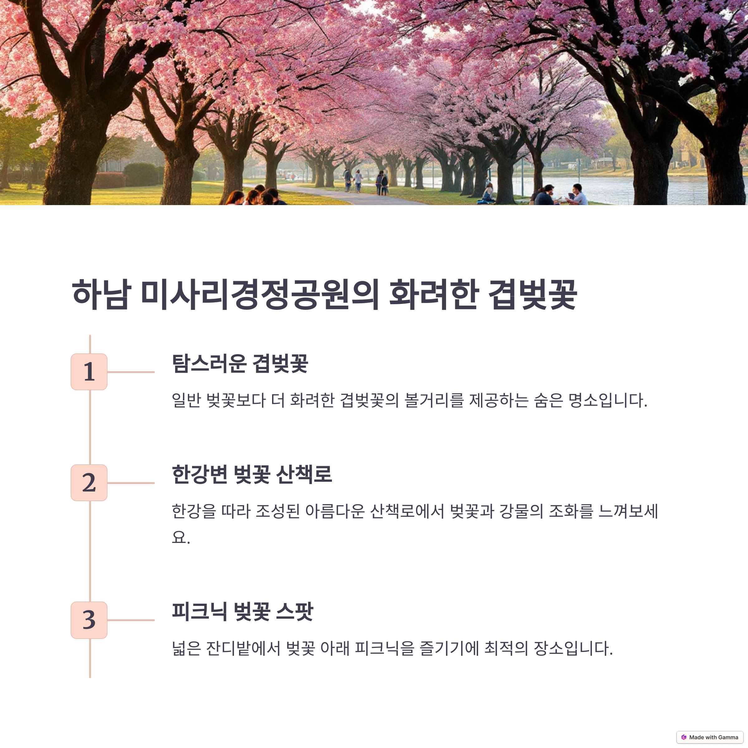 | 경기도 벚꽃 명소 | 남한산성 벚꽃길, 하남 미사리경정공원, 일산 호수공원, 가평 삼화리 벚꽃길 |