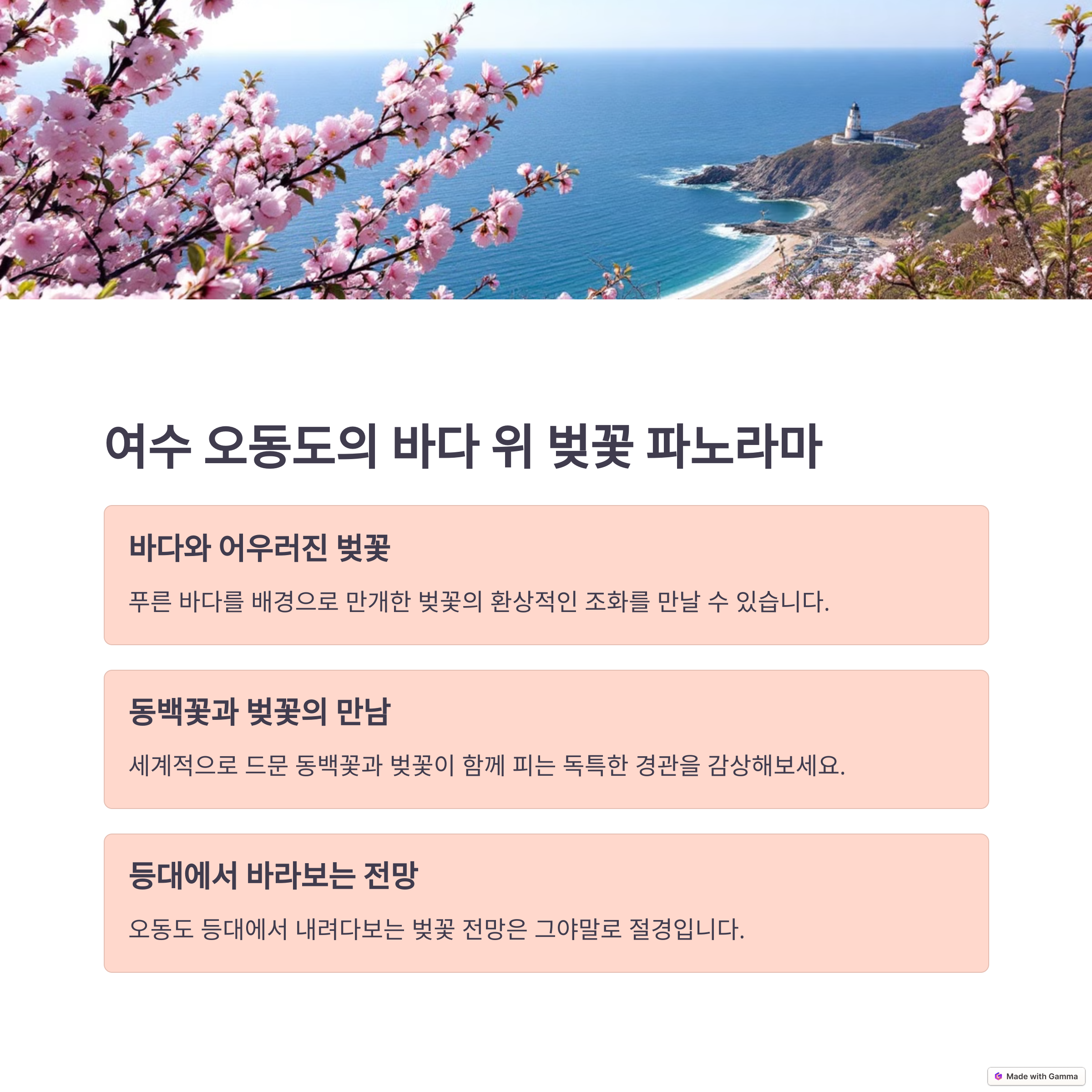 | 전라도 벚꽃 명소 | 광주 운천저수지, 전주 전북대학교, 여수 오동도 |