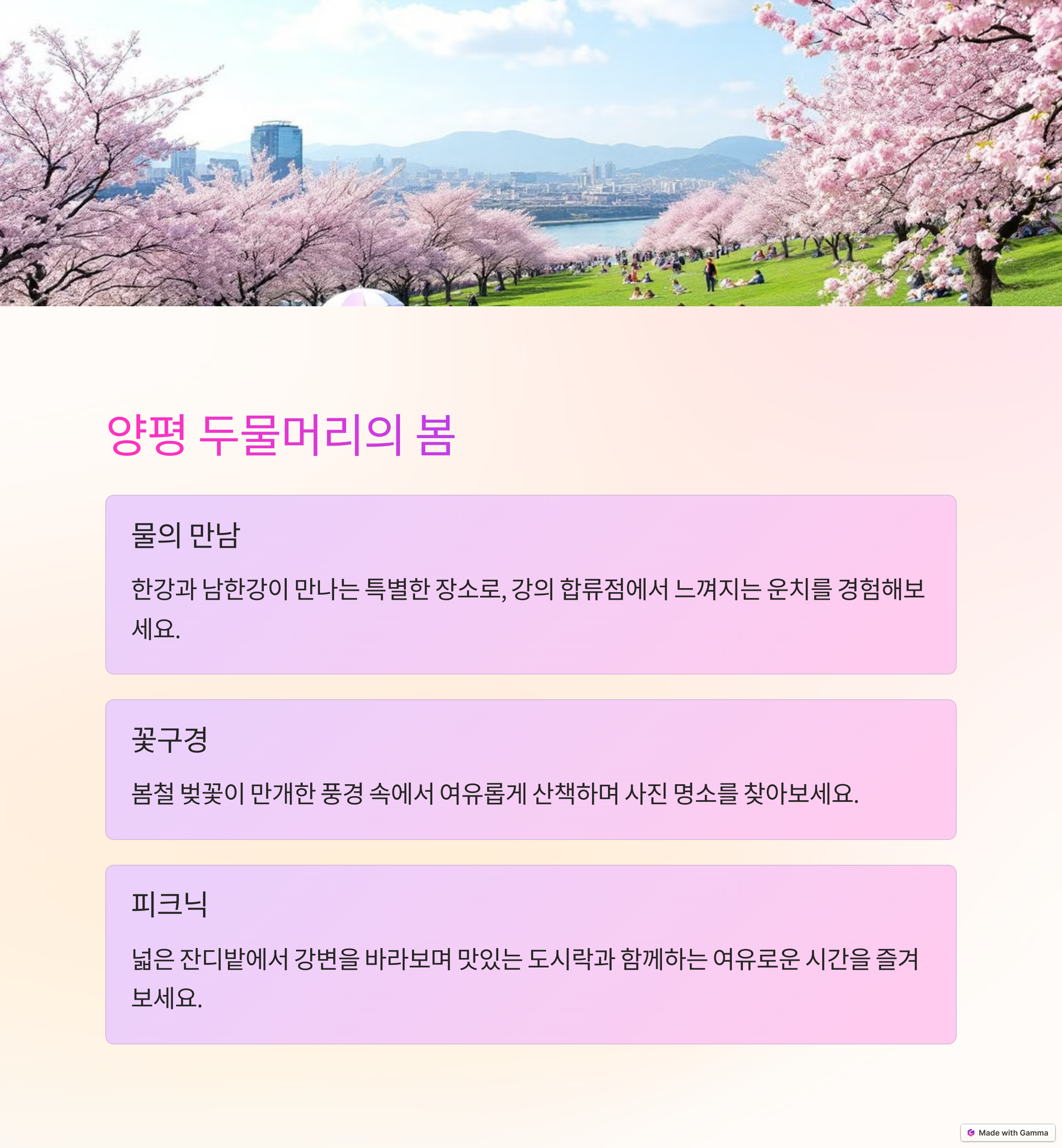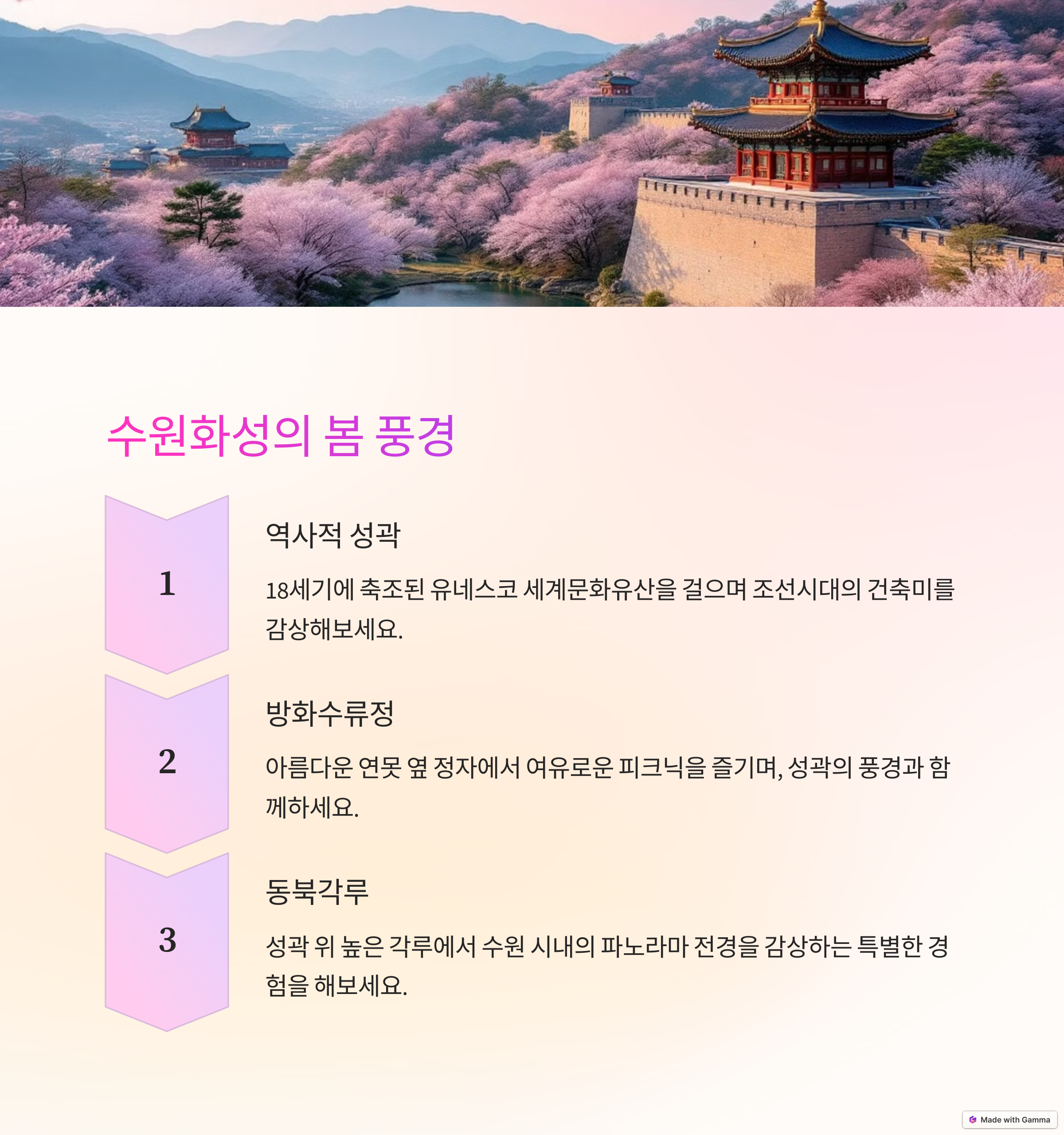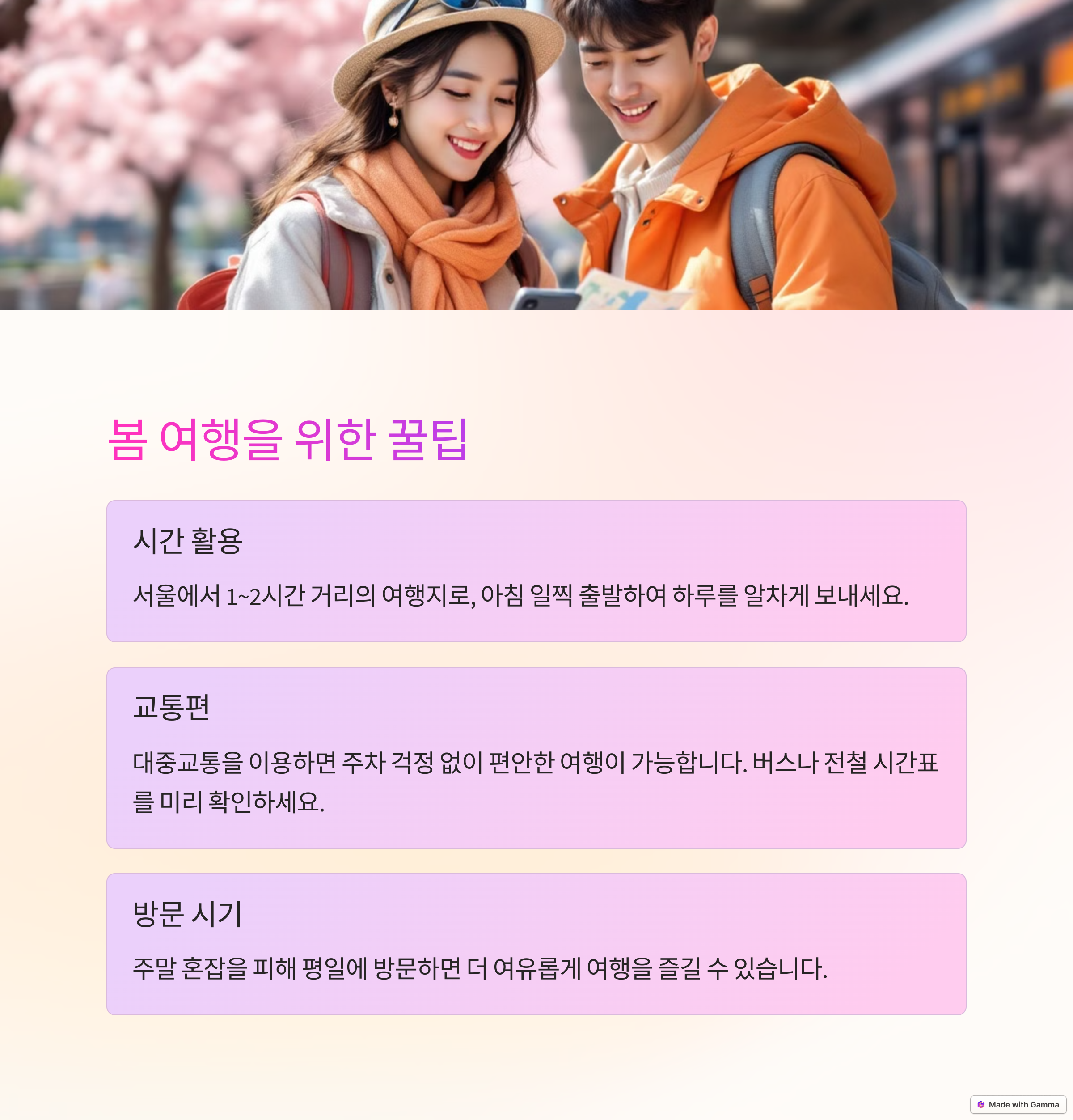 서울 근교에는 하루 만에 떠나도 충분히 자연과 역사, 문화를 즐길 수 있는 여행지가 많습니다. 2025년 봄을 맞아 벚꽃이 만개한 공원에서 피크닉을 하거나, 아름다운 강변을 따라 산책해보는 건 어떨까요? 새로운 여행지에서 소중한 추억을 만들어 보세요!