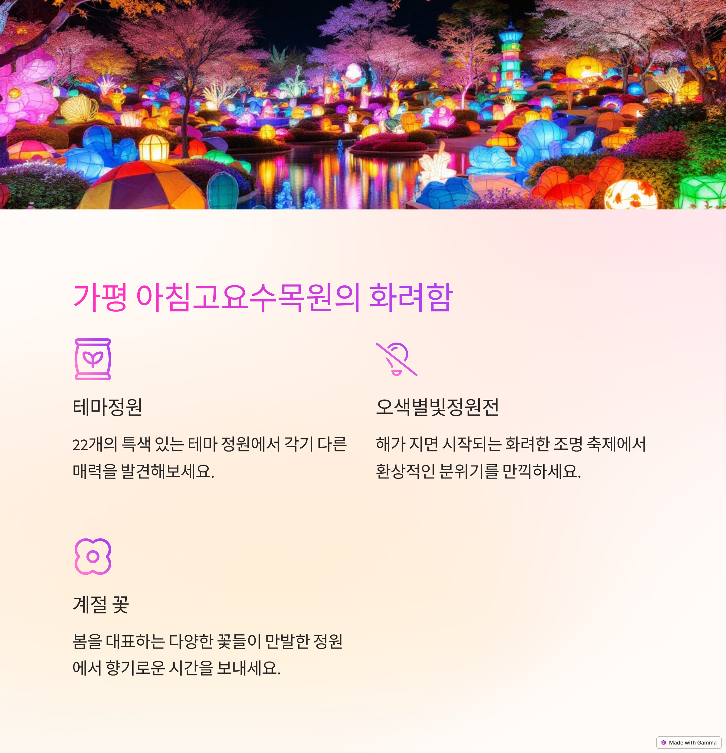| 아침고요수목원 | 오색별빛정원전 명소 | 야경 감상, 산책 |