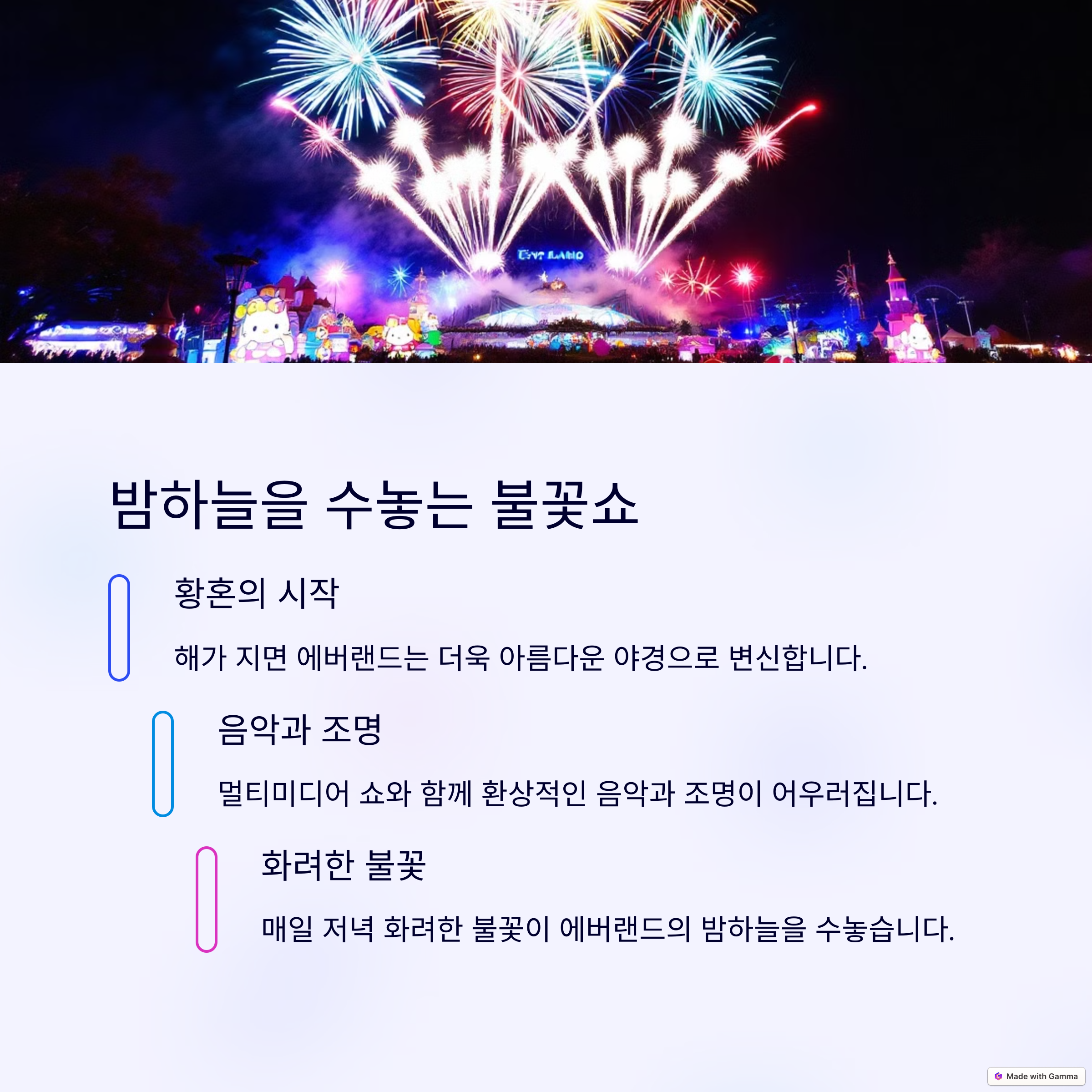 | 주요 테마 | 산리오캐릭터즈 콜라보레이션, 멀티미디어 불꽃쇼 |