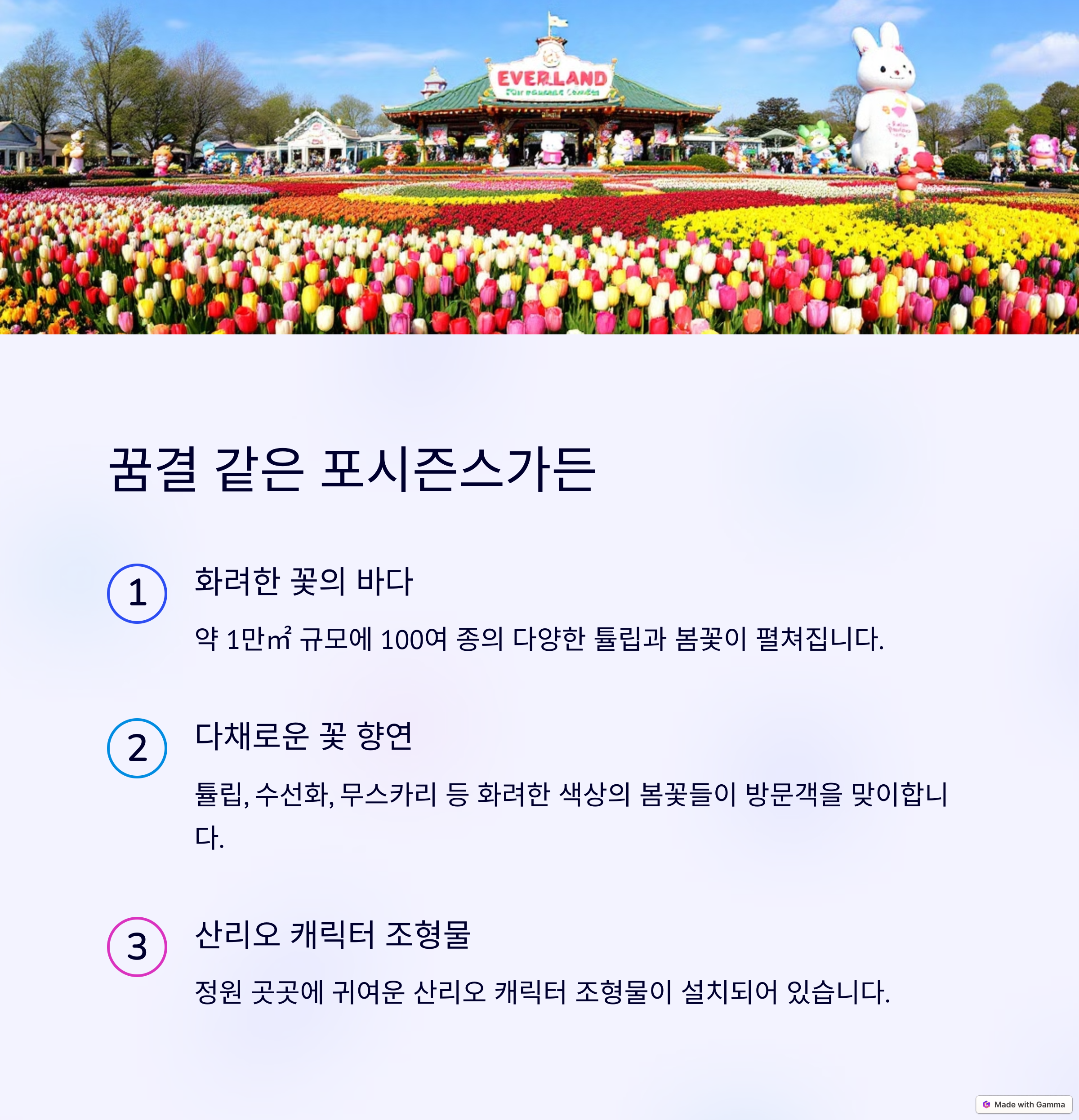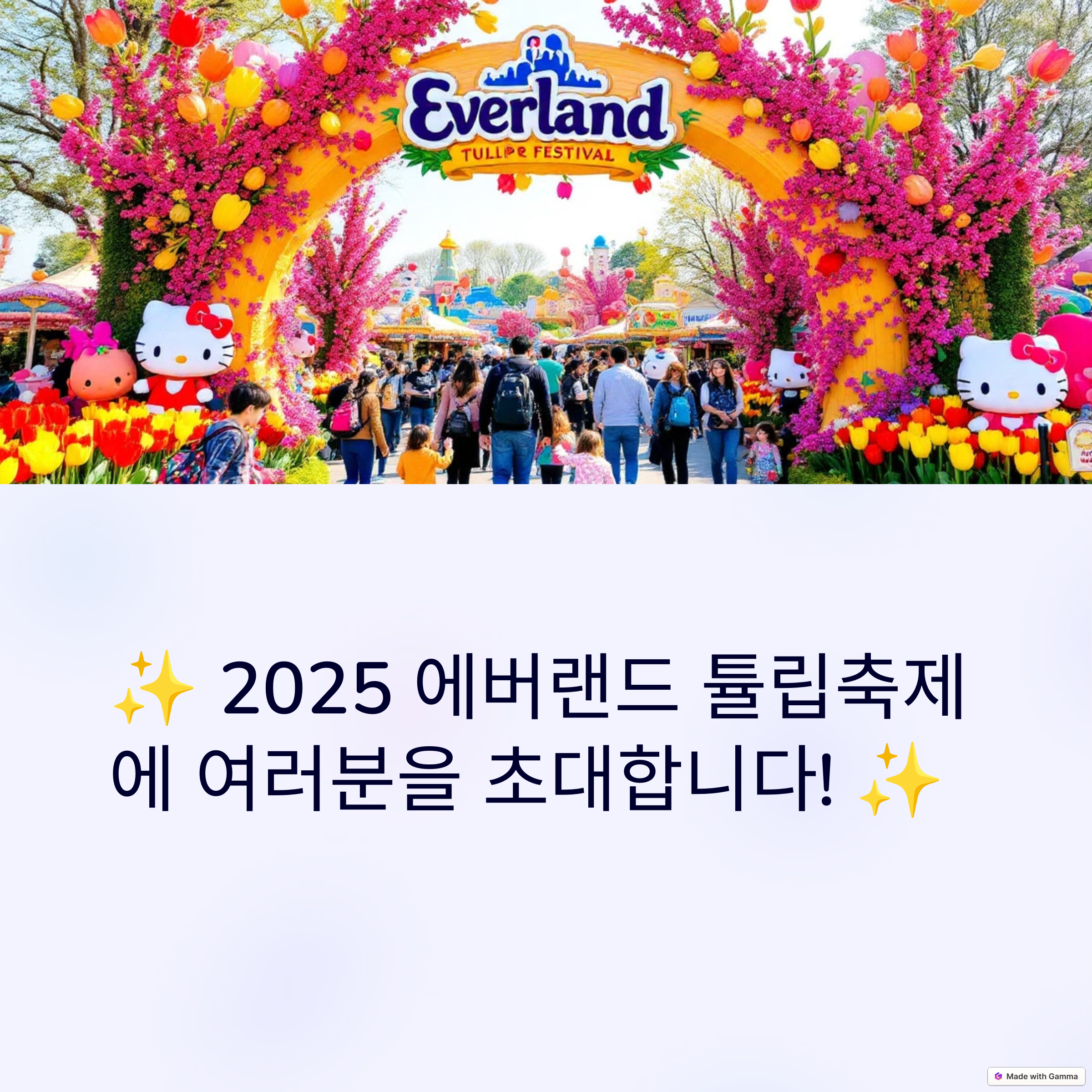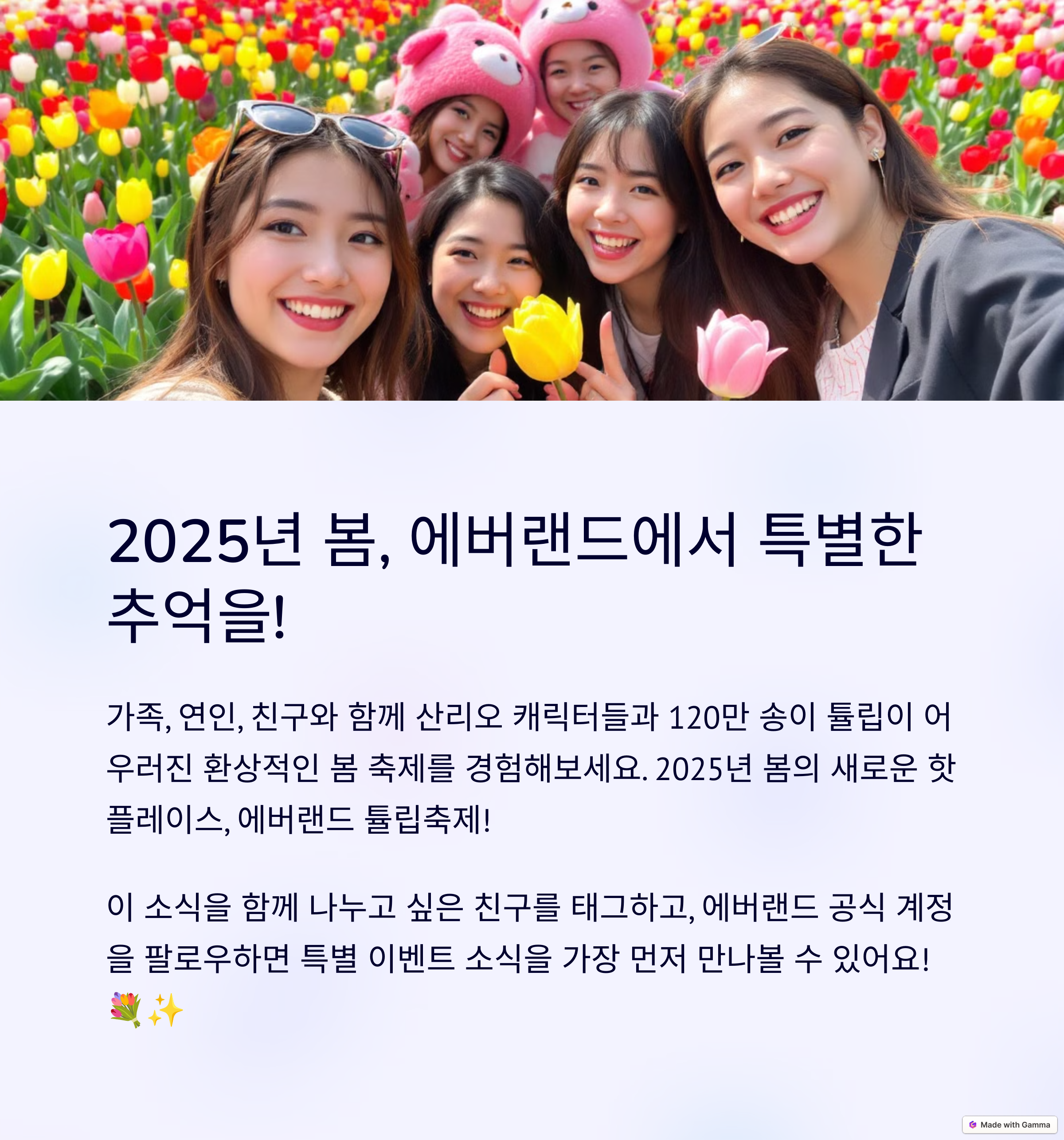 에버랜드 튤립축제 2025는 단순히 꽃을 감상하는 것을 넘어, 다양한 볼거리와 즐길 거리가 함께하는 이벤트입니다. 산리오캐릭터즈와의 콜라보레이션으로 어린이들뿐 아니라 성인들에게도 특별한 즐거움을 선사합니다. 지금 바로 에버랜드로 떠나 봄의 아름다움을 만끽해 보세요!