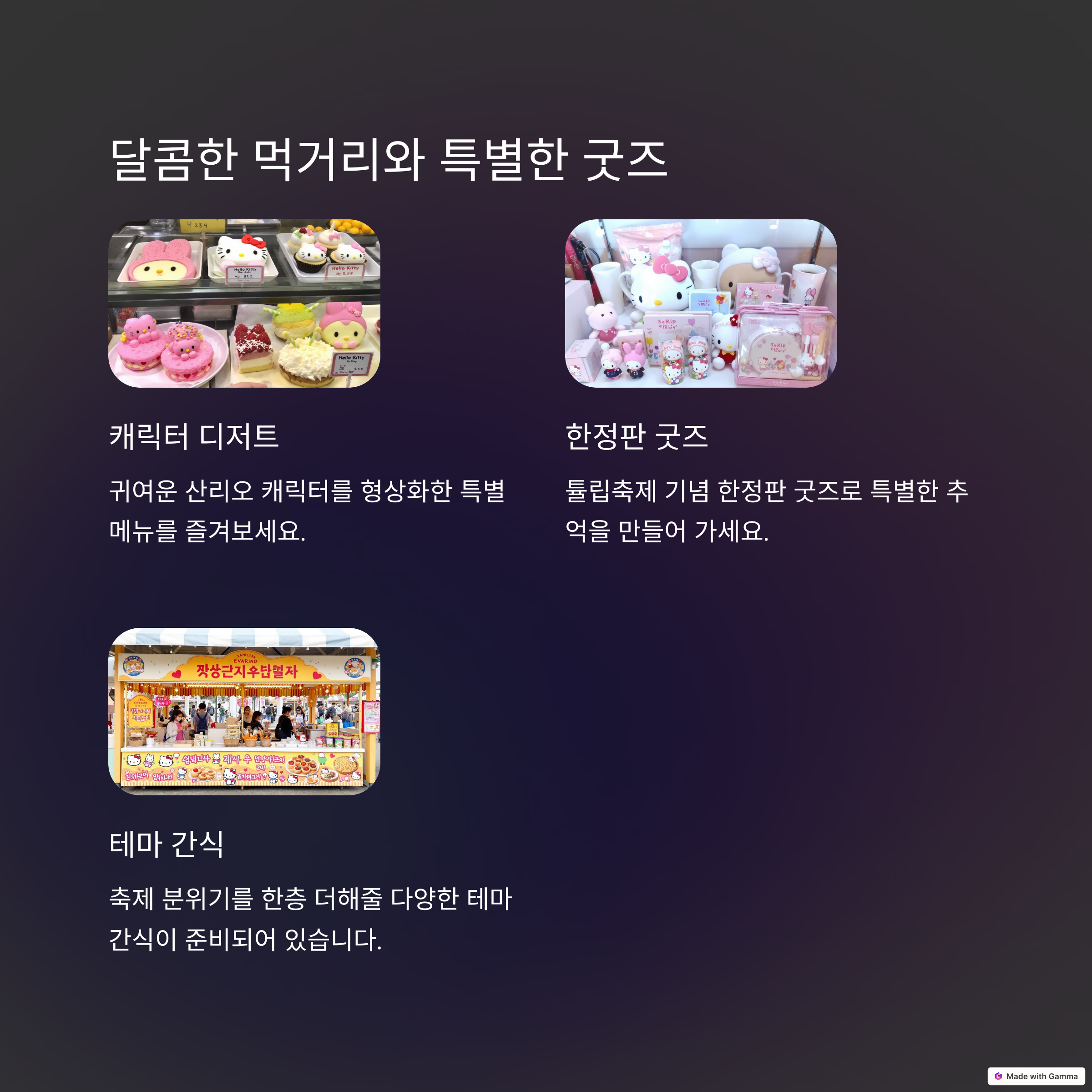 에버랜드 튤립축제 2025는 꽃을 사랑하는 모든 이들에게 최고의 봄나들이 장소로 손꼽히는 이벤트입니다. 특히 올해는 산리오캐릭터즈와의 콜라보레이션이 더해져 그 인기가 더욱 높아질 것으로 기대됩니다. 다양한 캐릭터 테마존과 공연을 비롯해 어트랙션, 먹거리, 굿즈까지 준비되어 있어 방문객들에게 다양한 즐거움을 선사할 예정입니다.