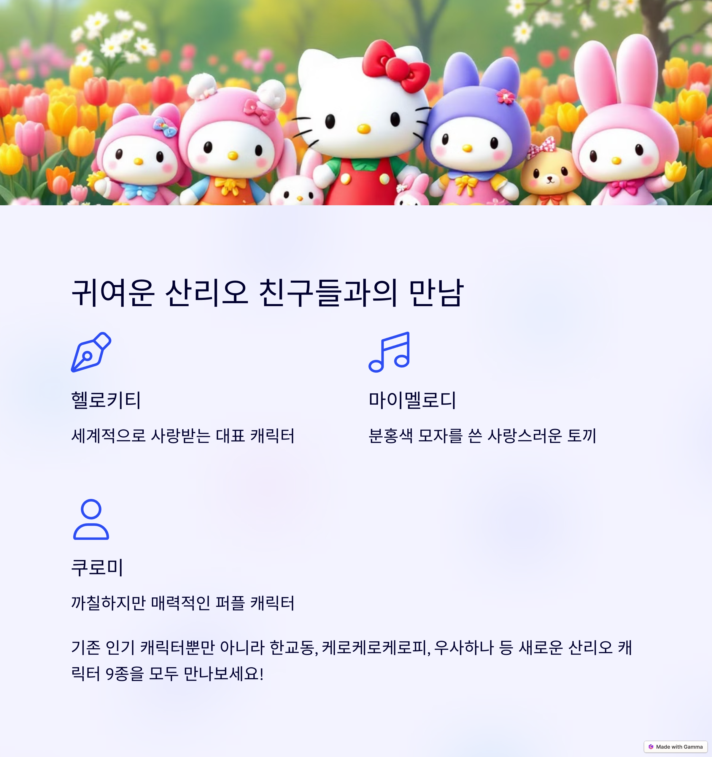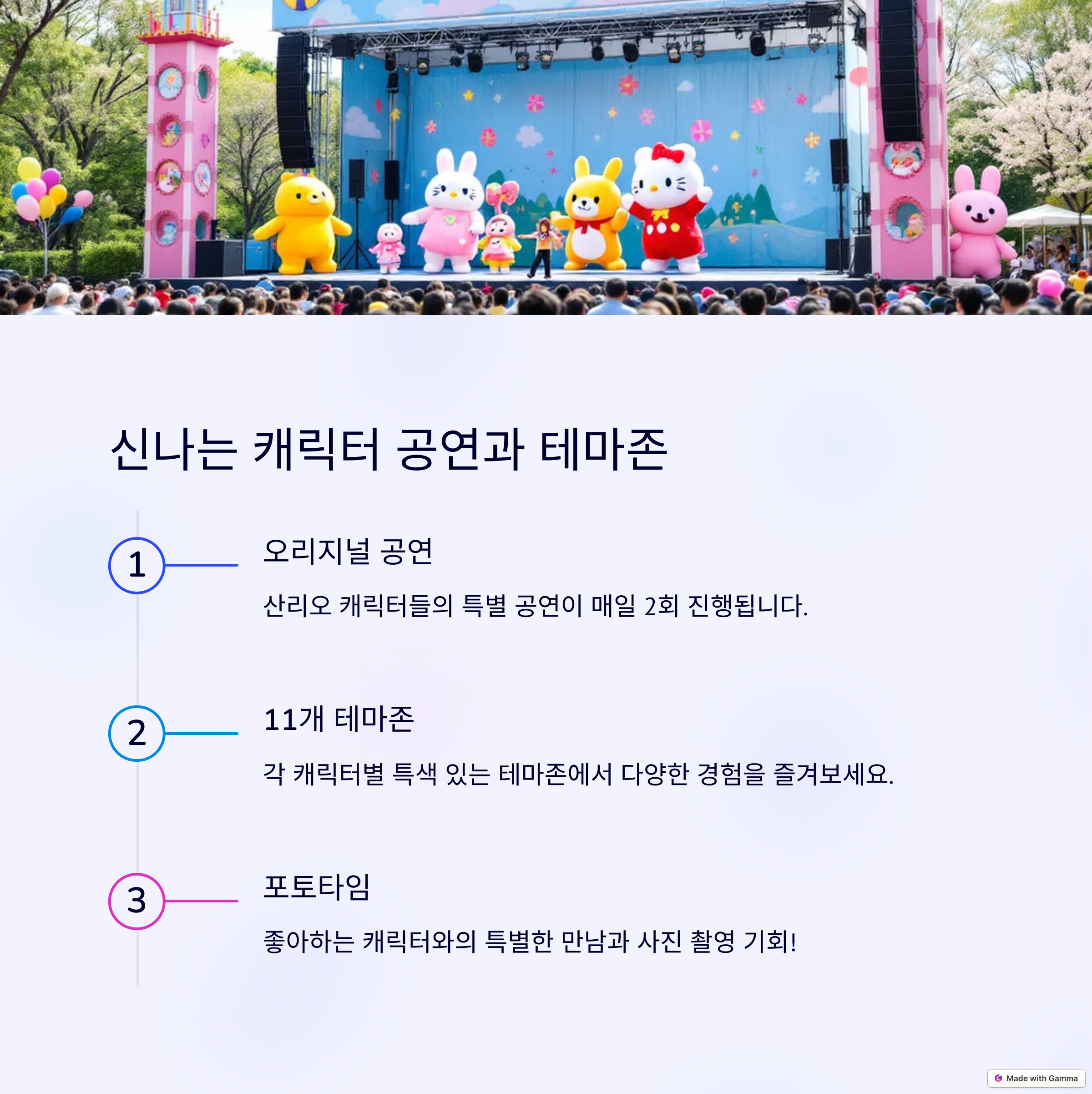 | 포시즌스가든에서 봄꽃 축제 | 총 9가지 산리오캐릭터즈 등장 | 가족, 연인, 친구들과 즐기는 봄날의 축제 |