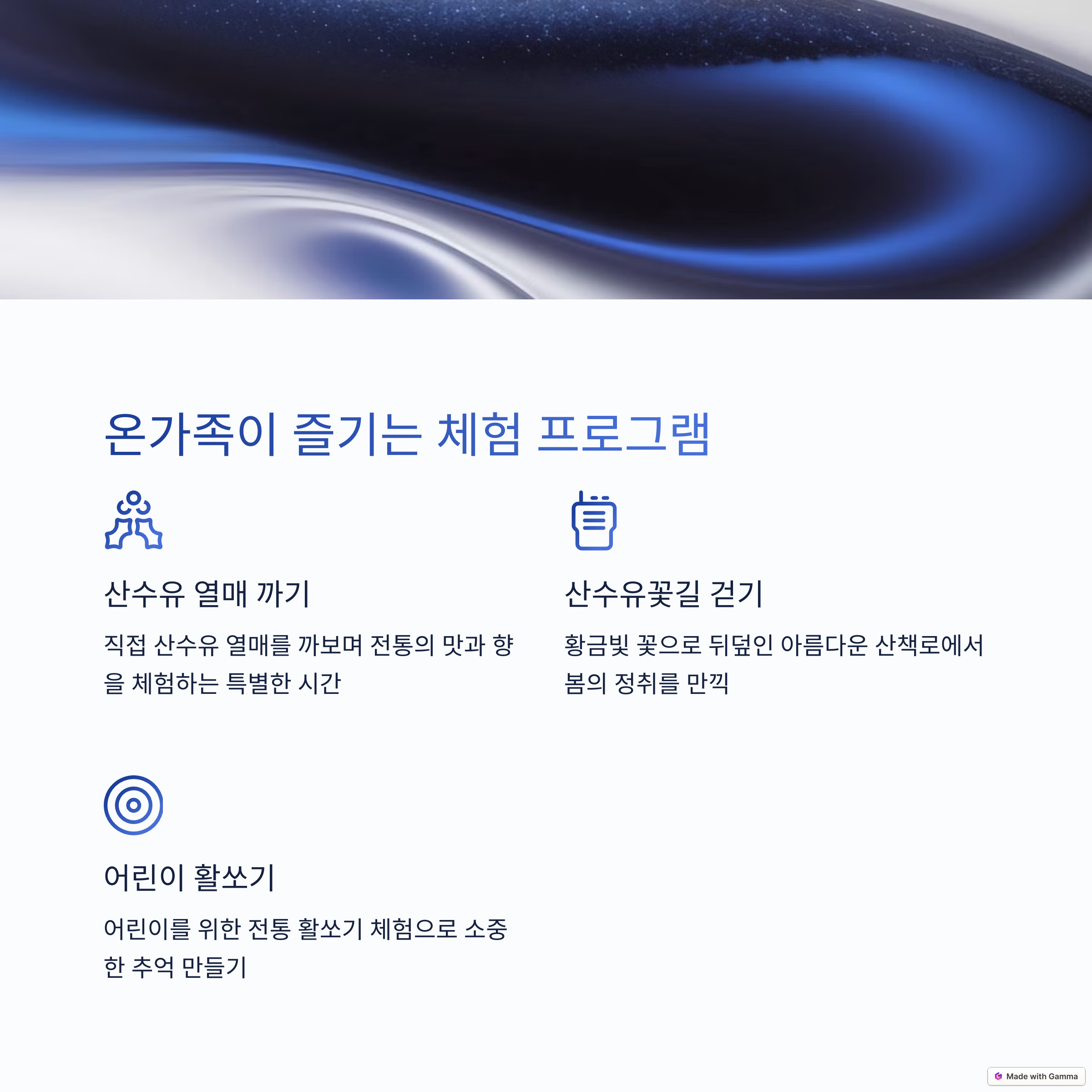 다양한 체험 프로그램 또한 축제의 재미를 더해줍니다. 산수유 열매 까기 대회, 산수유꽃길 걷기, 어린이 활쏘기 체험 등 남녀노소 누구나 즐길 수 있는 프로그램이 준비되어 있습니다. 특히 가족 단위 방문객을 위한 체험 공간이 마련되어 있어, 아이들과 함께 봄날의 추억을 쌓기에 최적의 장소입니다.