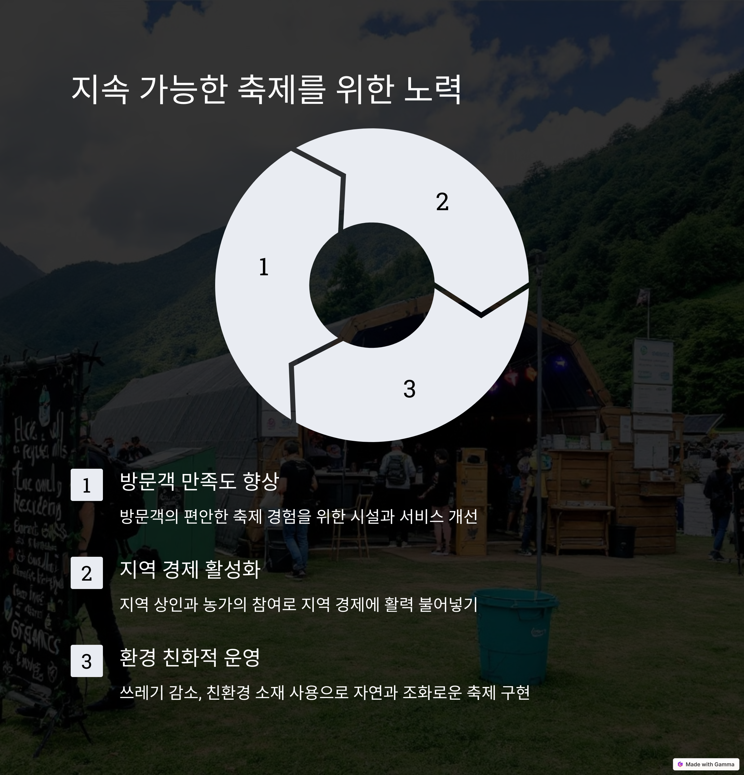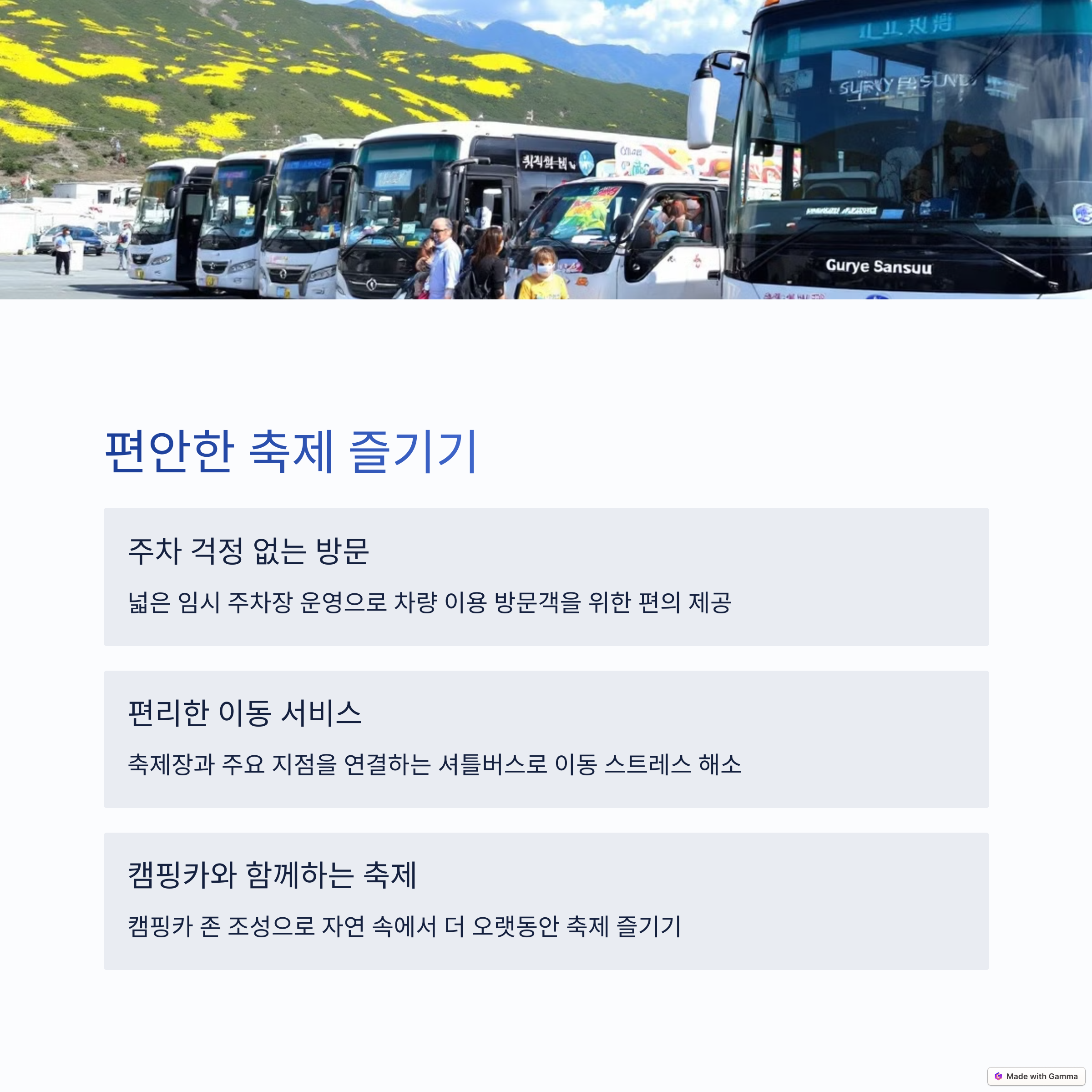 방문객들의 편의를 위해 다양한 조치가 마련되었습니다. 올해 축제에서는 임시 주차장과 셔틀버스를 운영하여 교통 혼잡을 줄이고, 캠핑카 존을 조성하여 캠핑을 즐기는 방문객들에게도 편의를 제공합니다. 또한, 불법 행위 단속과 바가지요금 근절을 강력하게 추진하여 누구나 안심하고 축제를 즐길 수 있도록 운영될 예정입니다.