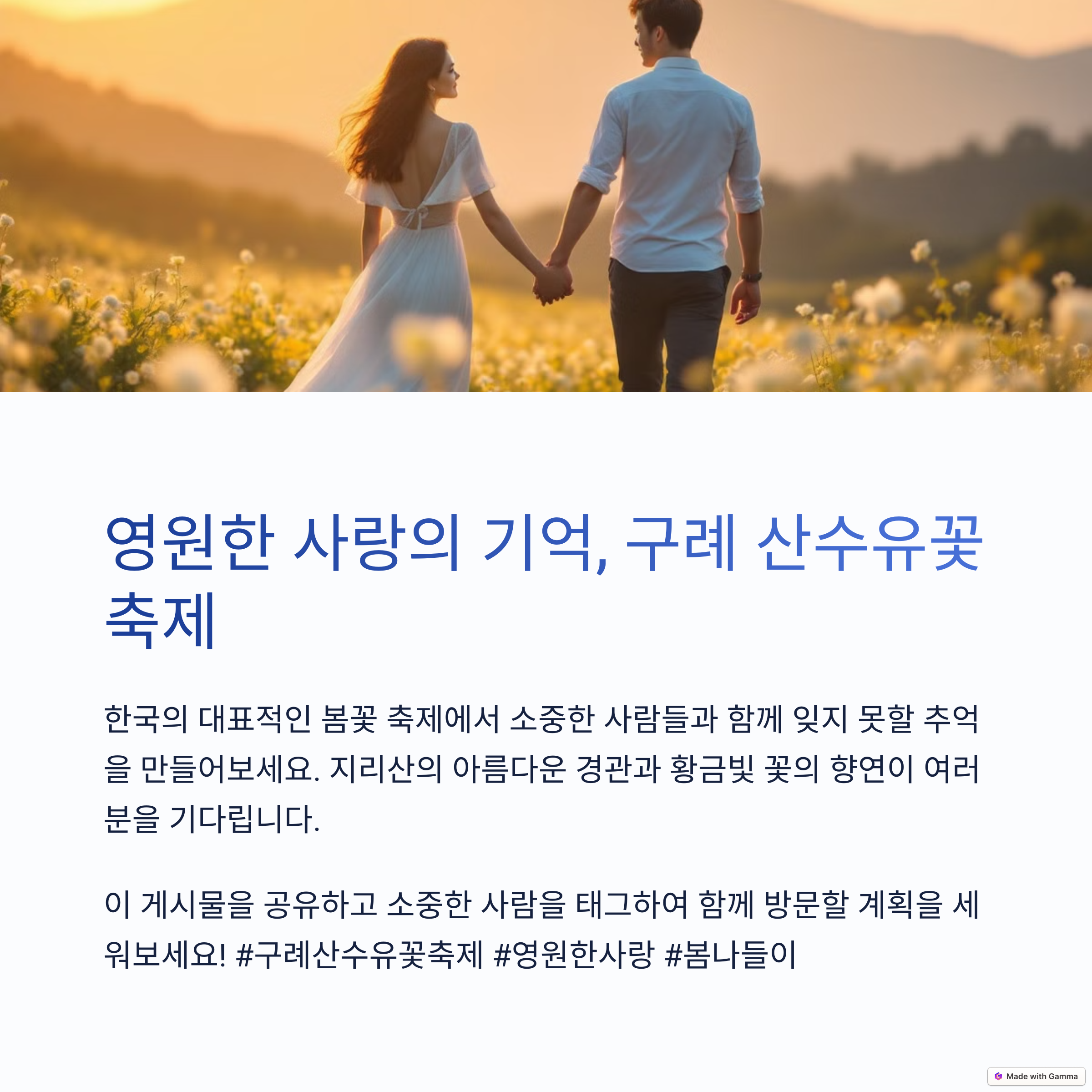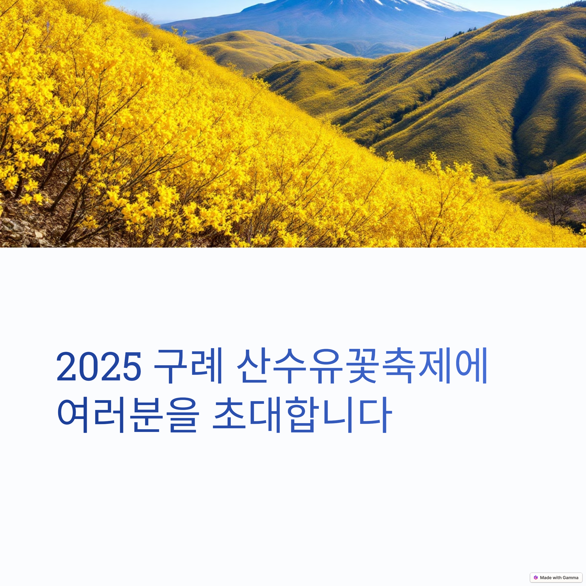 봄이 찾아오면 한국 곳곳에서는 아름다운 꽃 축제가 열립니다. 그중에서도 구례 산수유꽃축제는 봄의 시작을 알리는 특별한 행사로 손꼽힙니다. 2025년 구례 산수유꽃축제는 3월 15일부터 23일까지 전라남도 구례군 산동면 지리산온천관광지 일원에서 개최됩니다. "영원한 사랑을 찾아서"라는 낭만적인 주제로 진행되는 이 축제는 노랗게 물든 산수유꽃과 함께 다채로운 프로그램을 즐길 수 있는 기회입니다. 올해 축제에서는 방문객 편의를 최우선으로 고려하여 셔틀버스 운영, 임시 주차장 확보, 캠핑카 존 조성 등의 다양한 시설이 마련되었습니다. 또한, 불법 행위 단속과 바가지요금 근절을 강력히 추진하여 보다 쾌적한 축제 환경을 조성할 예정입니다. 아름다운 봄꽃과 함께하는 특별한 순간을 놓치지 마세요!