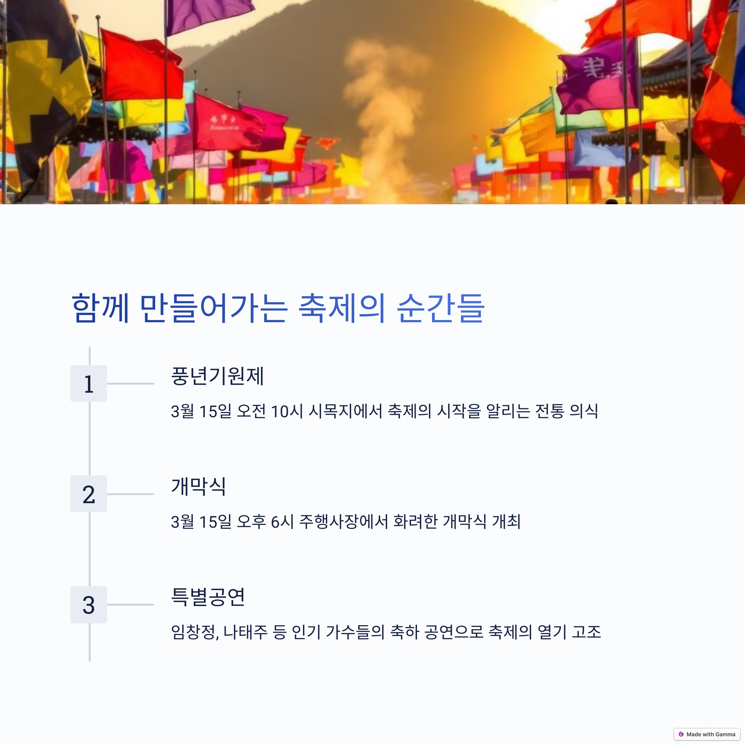 구례 산수유꽃축제는 매년 봄이 시작될 무렵, 지리산 자락을 노랗게 물들이는 산수유꽃과 함께 열리는 대표적인 꽃 축제입니다. 올해는 3월 15일 오전 10시 시목지에서의 풍년기원제로 시작되며, 같은 날 오후 6시 주행사장에서 화려한 개막식이 진행됩니다. 임창정, 나태주 등 인기 가수들의 공연이 펼쳐질 예정이니, 화려한 무대와 함께 따뜻한 봄을 만끽해 보세요.