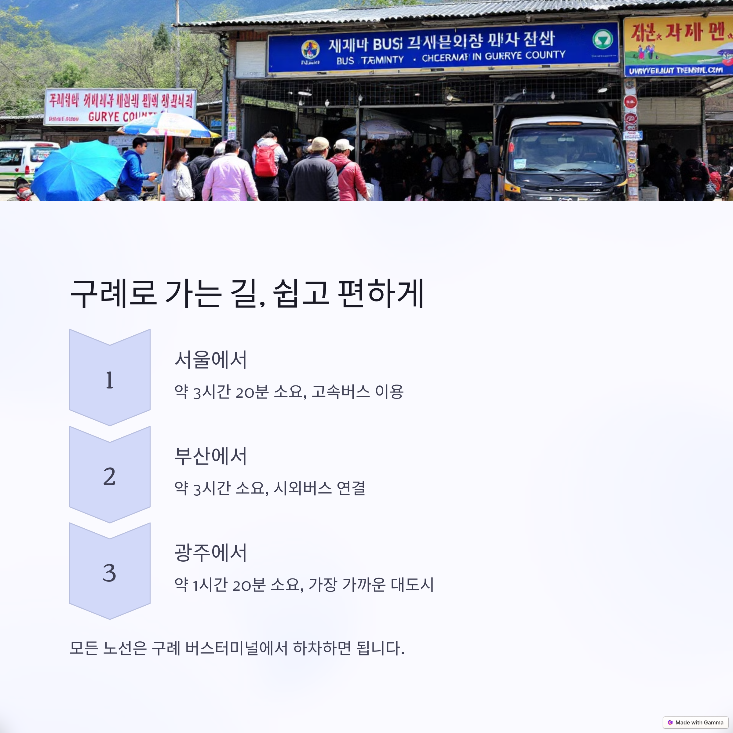 축제장 방문 시 대중교통을 이용하는 경우, 구례 버스터미널에서 하차하면 됩니다. 서울에서는 약 3시간 20분, 부산에서는 약 3시간, 광주에서는 약 1시간 20분이 소요됩니다. 또한 축제 기간 중에는 셔틀버스가 운행되며, 1구간(대형버스주차장~산수유문화관~나들이장터)과 2구간(산수유문화관~반곡마을~하위마을~상위마을회관~월계마을~평촌마을) 등으로 나뉘어 운영됩니다.