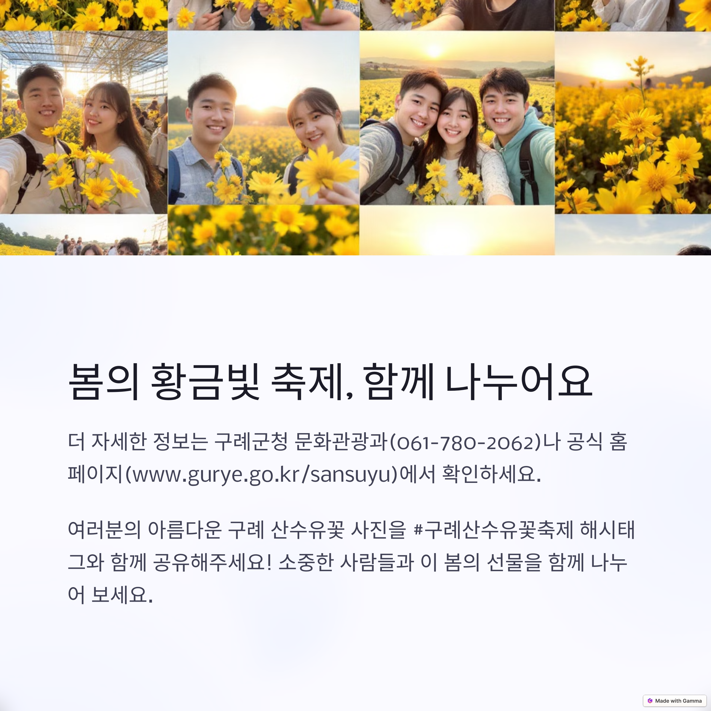 특히 축제 기간 중 다양한 공연과 체험 행사들이 마련되어 있어 가족, 친구, 연인과 함께 특별한 추억을 만들기에 더없이 좋은 기회가 될 것입니다. 여러분도 올봄, 아름다운 구례 산수유꽃축제를 방문해 보세요!