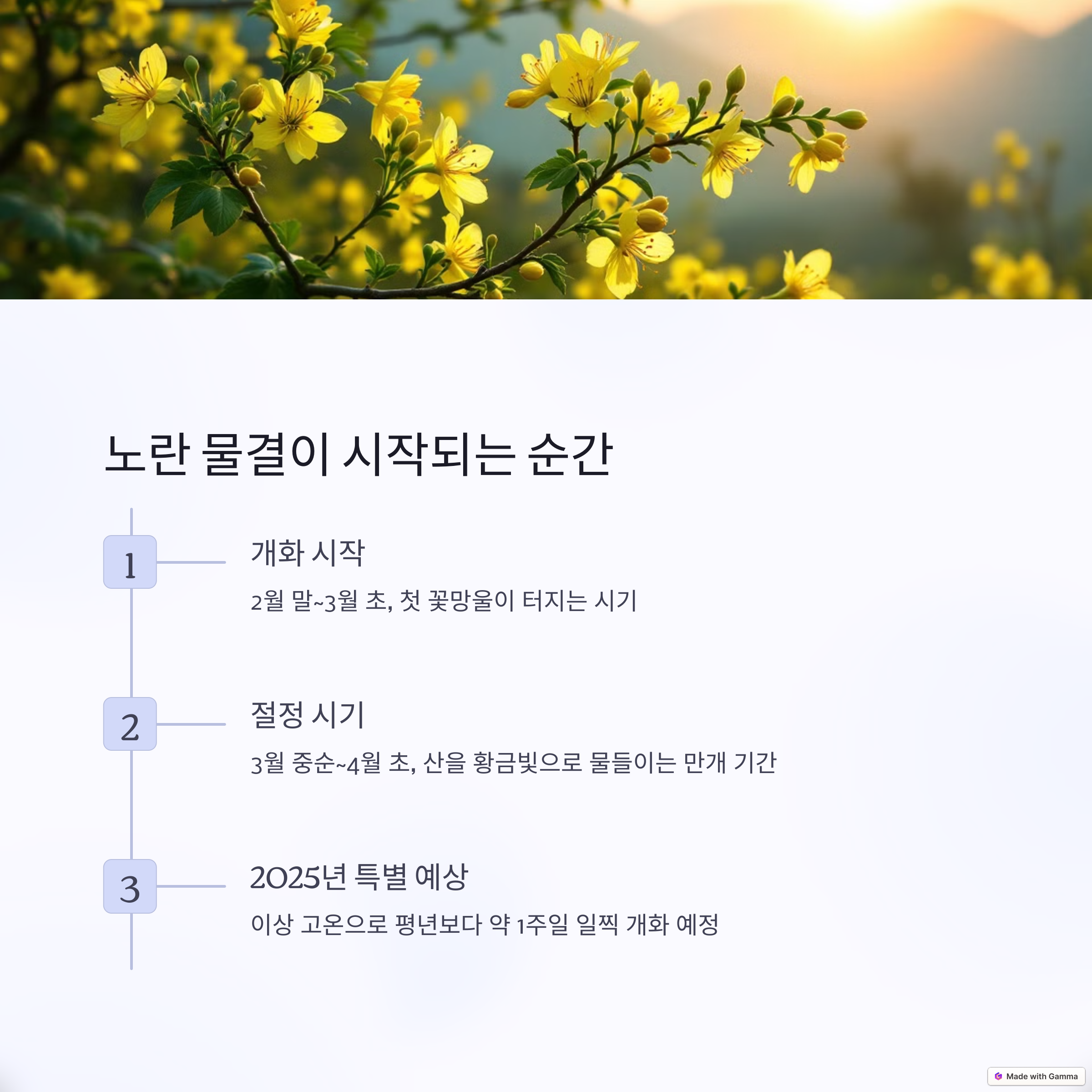 2025년 산수유 개화 시기는 일반적으로 2월 말부터 3월 초이며, 만개 시기는 3월 중순에서 4월 초 사이입니다. 하지만 올해는 이상 고온의 영향으로 약 1주일 정도 앞당겨 개화할 가능성이 큽니다. 따라서 축제 방문을 계획하고 계신다면 3월 초부터 방문하는 것이 가장 아름다운 풍경을 감상할 수 있는 최적의 시기가 될 것입니다.