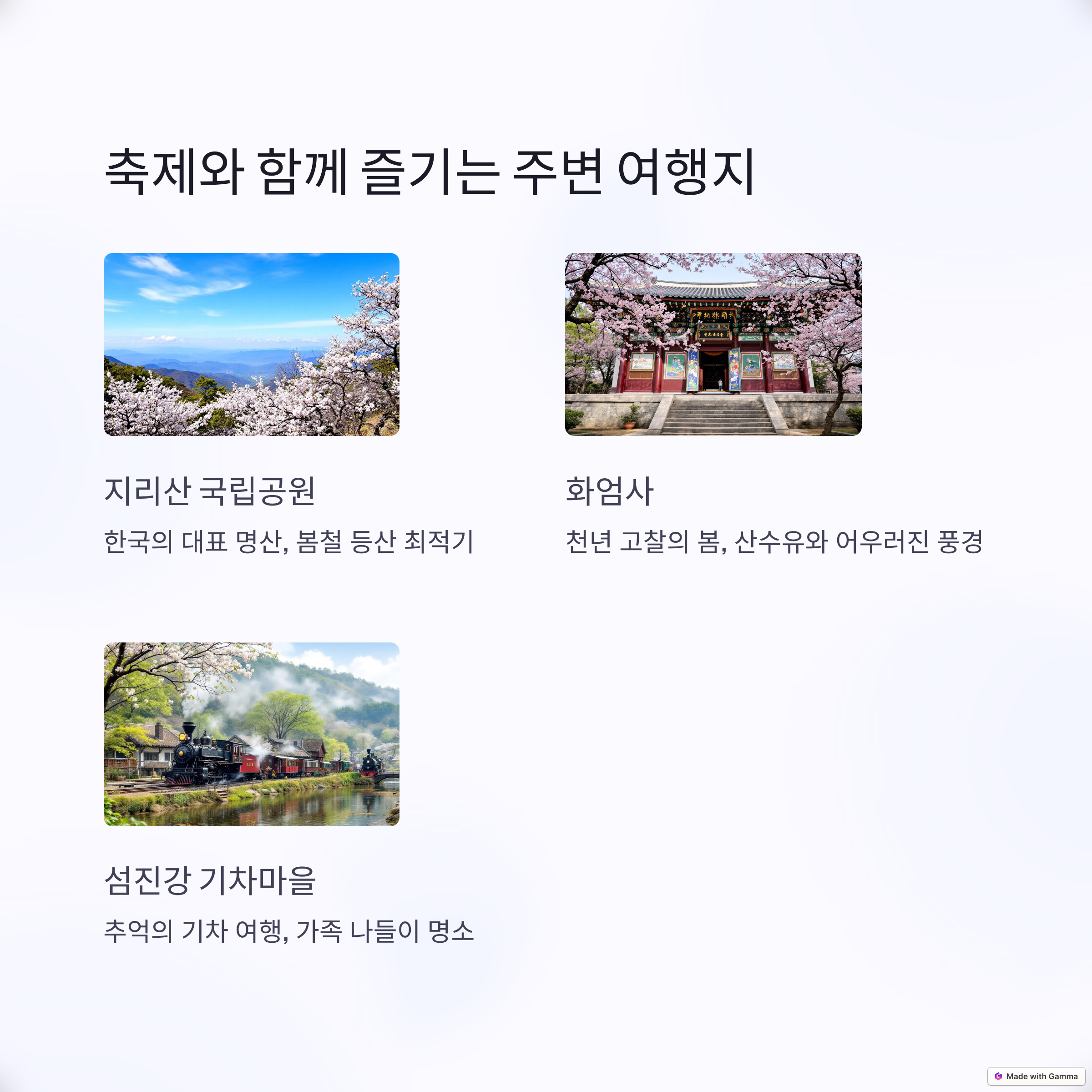 | 전라남도 구례군에서 개최되는 봄꽃 축제 | 2월 말부터 개화, 3월 중순 만개 예상 | 축제 기간 중 무료 셔틀버스 운영 |