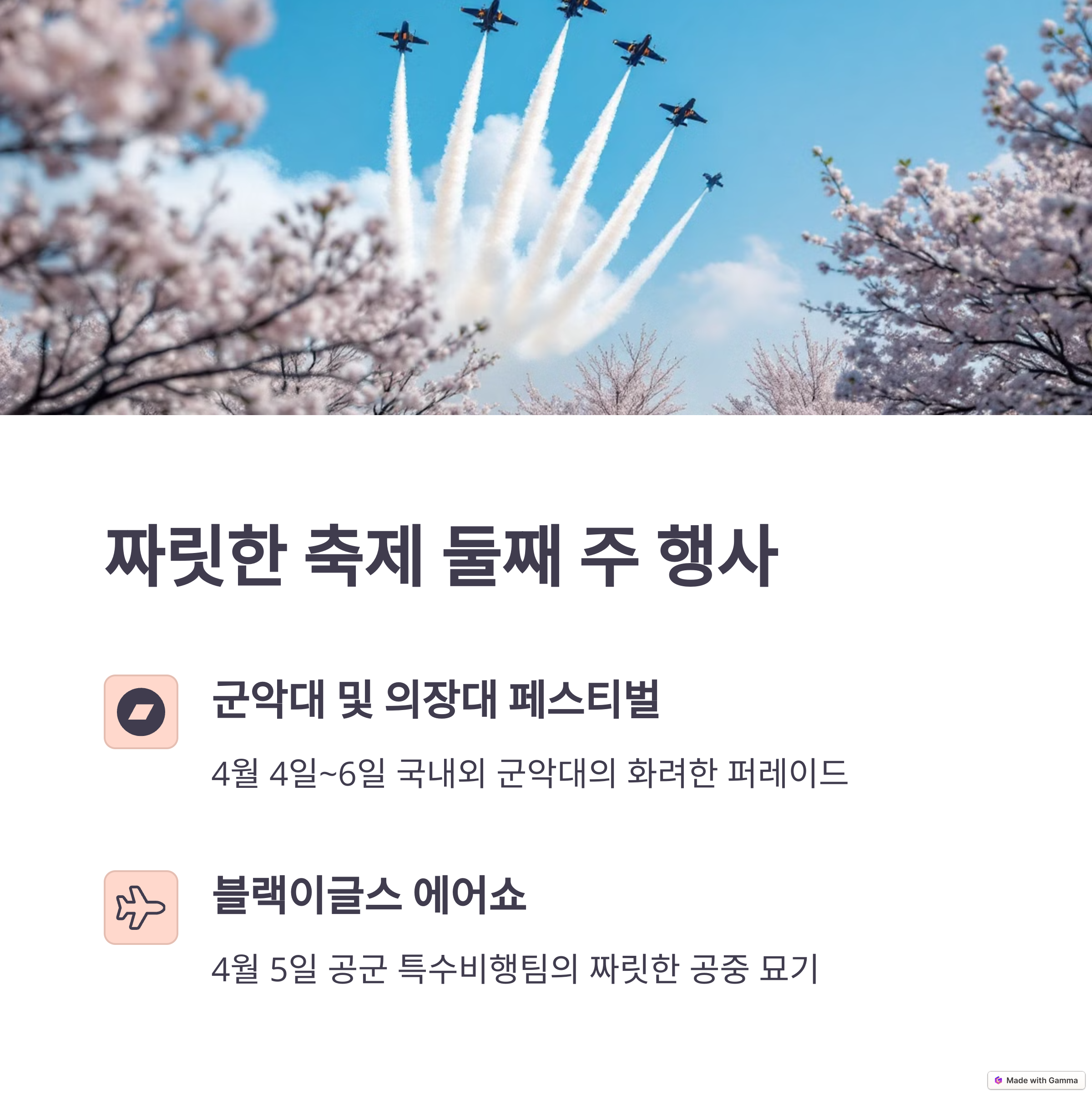 | 추천 일정 | 개막식(3/28), 불꽃쇼(4/2), 블랙이글스 에어쇼(4/5) |