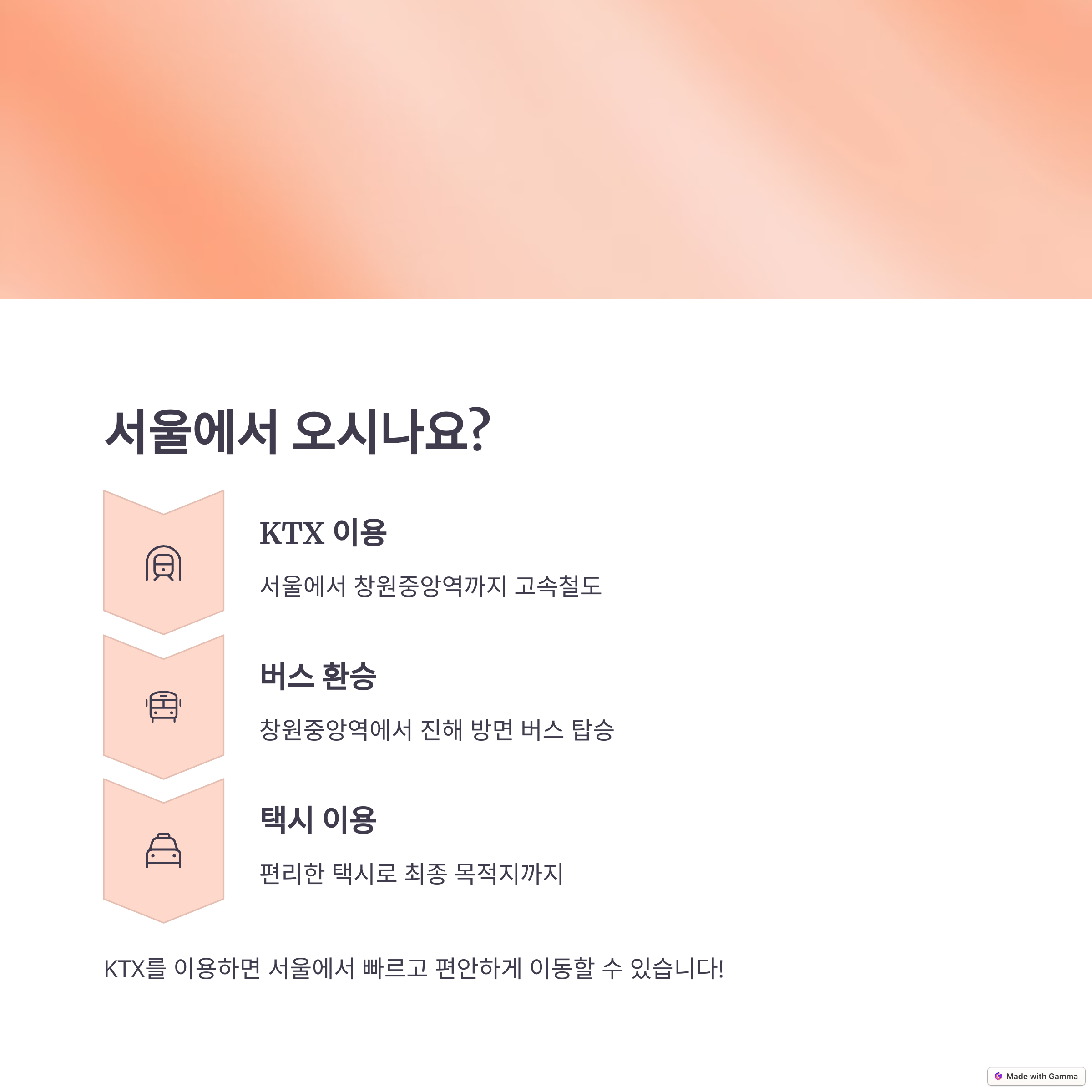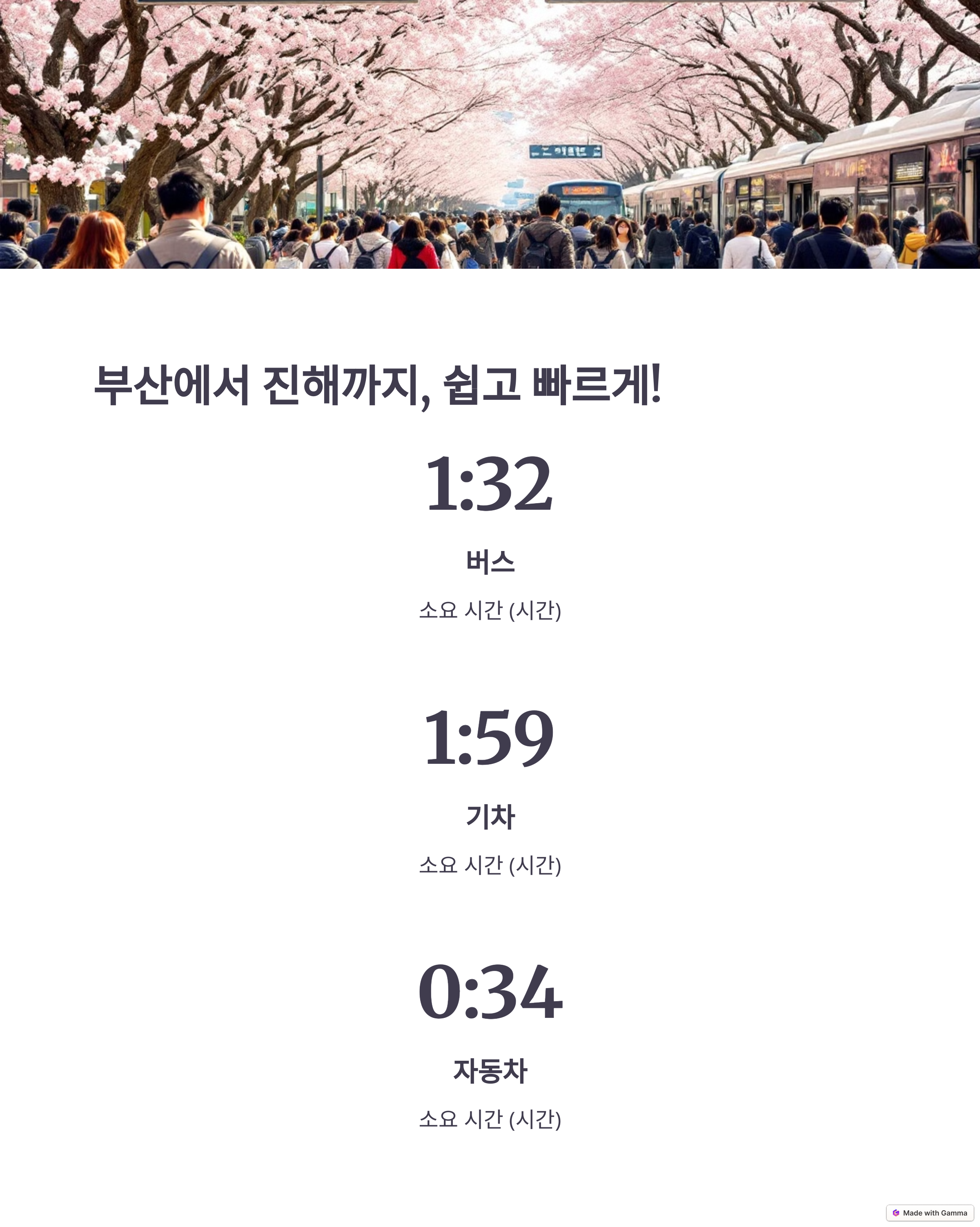 | 교통편 | 부산 → 버스(1시간 32분), 기차(1시간 59분), 자동차(34분) |