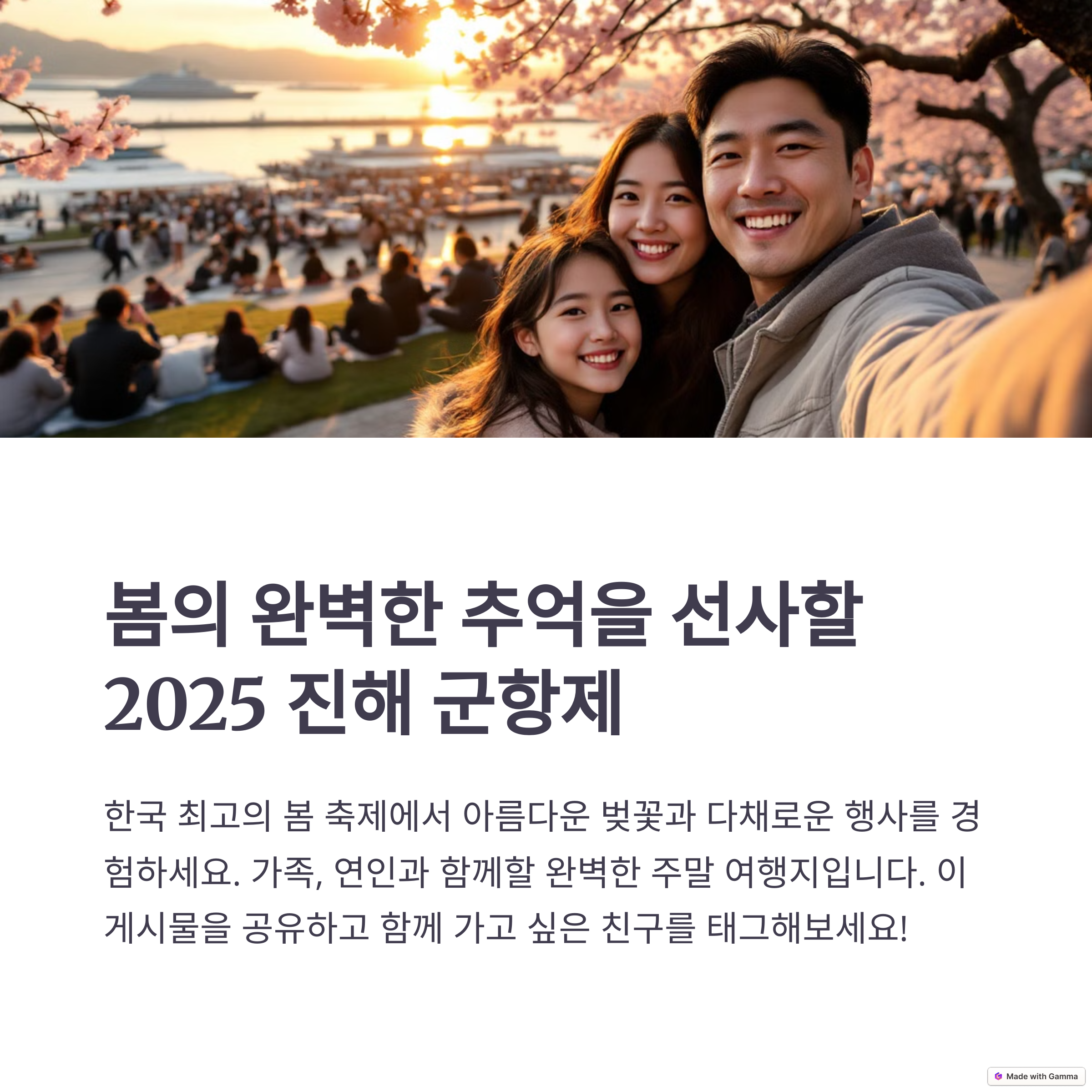 2025년 진해 군항제는 그 어느 때보다 풍성한 볼거리와 즐길 거리로 가득 차 있습니다. 아름다운 벚꽃이 만개하는 이 시기에, 사랑하는 사람들과 함께 추억을 만들어 보세요. 주말 여행지로 완벽한 진해에서 특별한 봄날을 경험해보세요!