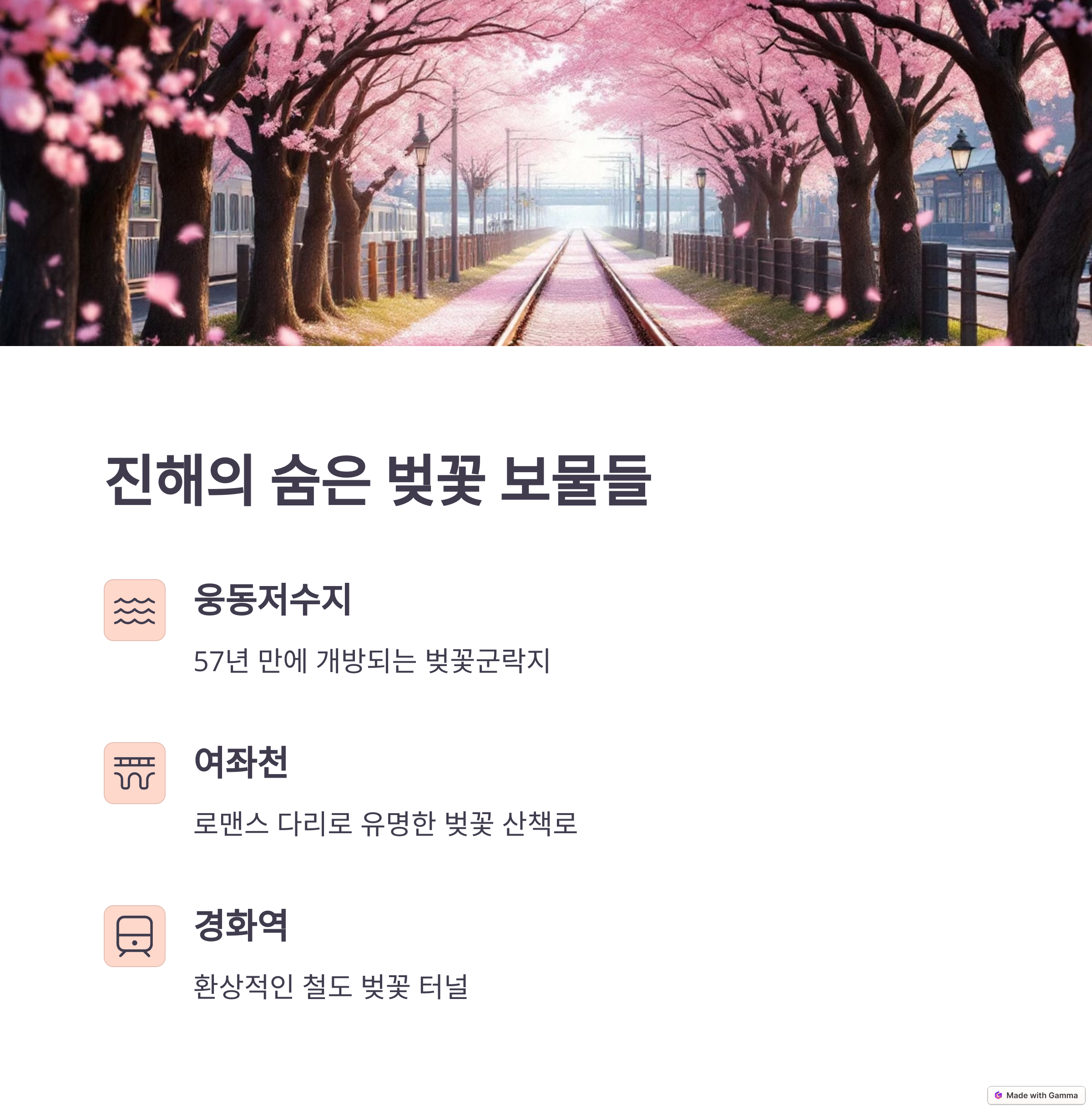 | 주요 명소 | 여좌천, 경화역, 웅동저수지 벚꽃군락지 |