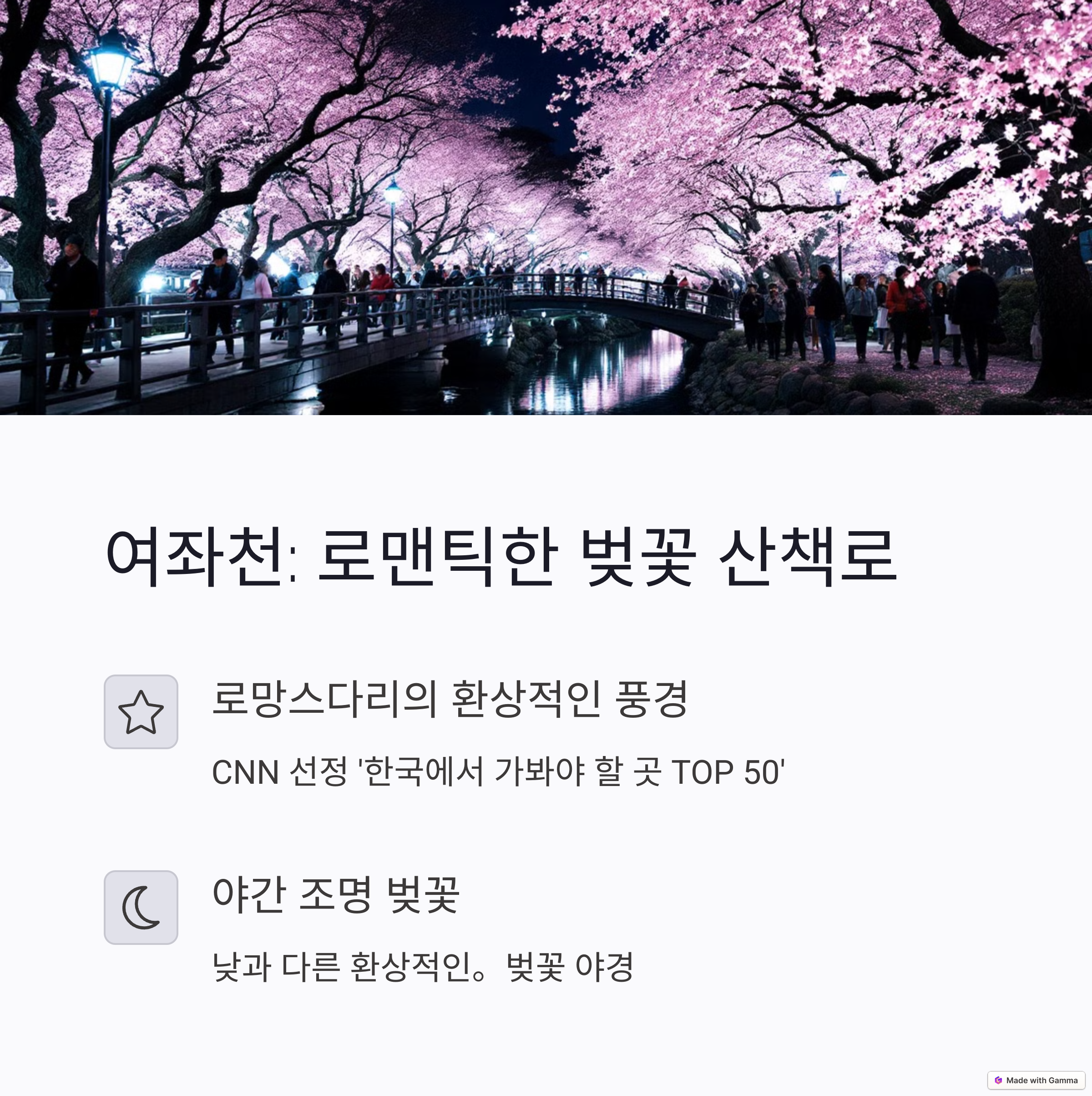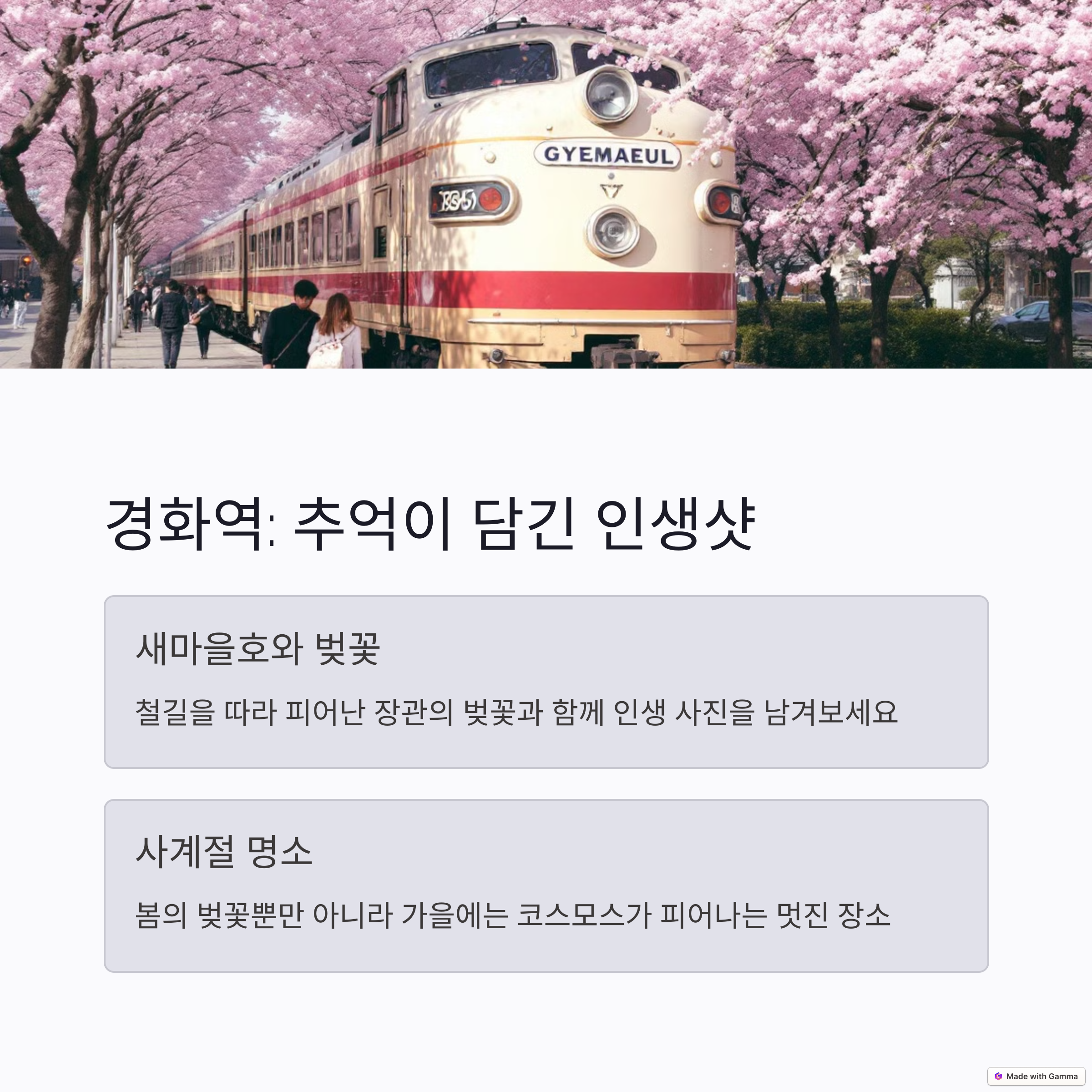 | 벚꽃 터널과 야경 | 경화시장 또는 석동 맛집거리 방문 | 조용한 호숫가 산책 코스 |