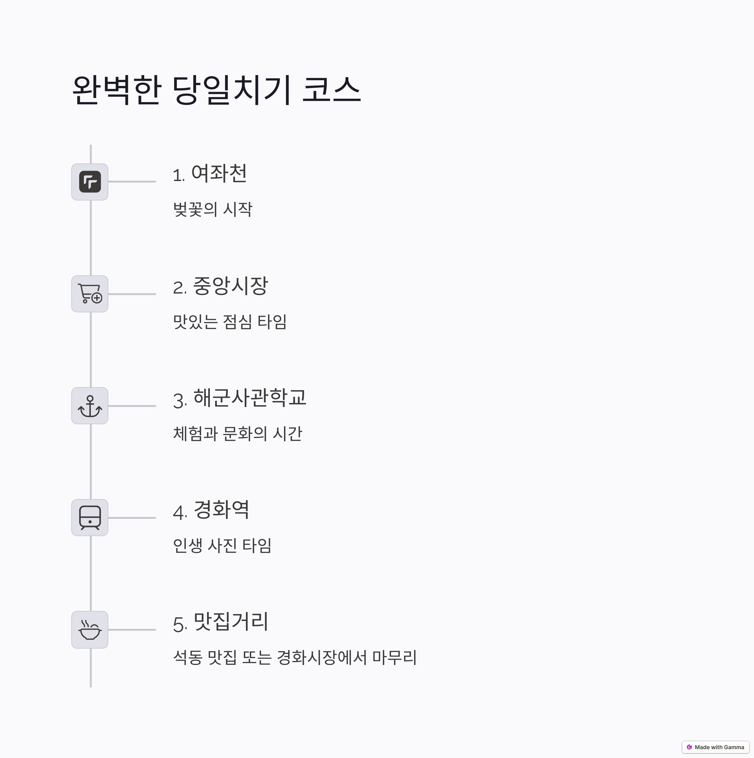 보다 효율적으로 진해 군항제를 즐기고 싶다면 추천 코스를 참고하세요. 여좌천 → 중앙시장 → 해군사관학교 → 경화역 → 경화시장 또는 석동 맛집거리 순으로 이동하면 벚꽃 감상뿐만 아니라 맛집 탐방과 지역 문화 체험도 함께할 수 있습니다. 특히 중앙시장에서 현지 음식을 맛보며 잠시 휴식을 취한 후 해군사관학교에서 다양한 체험 프로그램에 참여하는 것도 좋은 선택입니다.