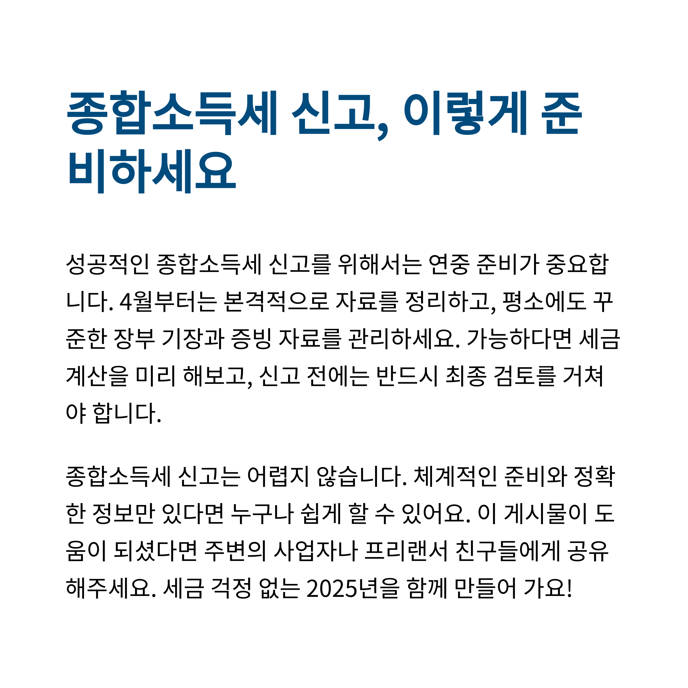 복잡한 경우 세무사 상담을 받는 것도 좋은 방법입니다. 2025년 종합소득세 신고, 준비된 만큼 수월하게 끝낼 수 있습니다!