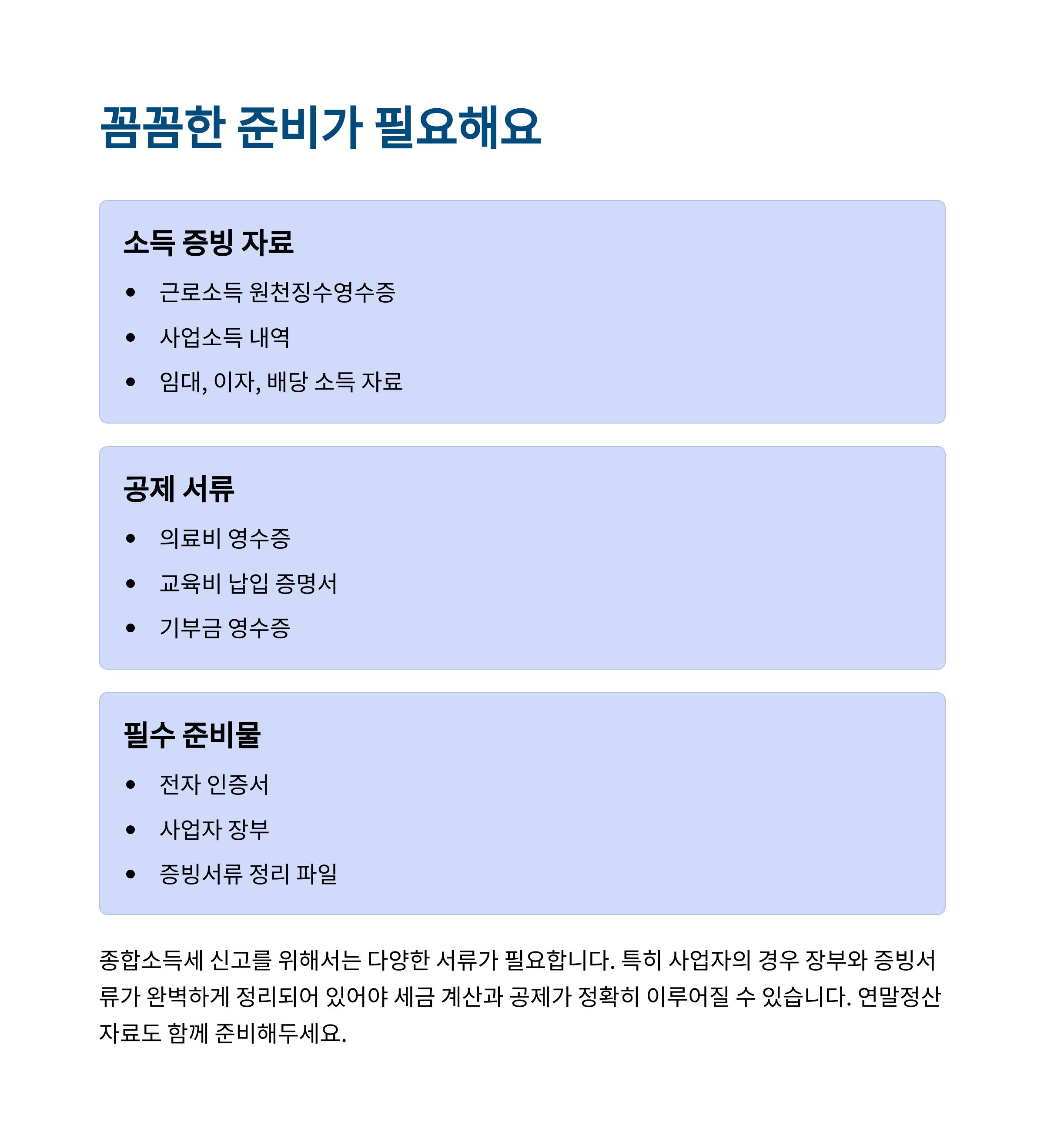 종합소득세 신고를 위해서는 소득 증빙 자료와 세액 공제 관련 서류를 꼼꼼하게 준비해야 합니다.