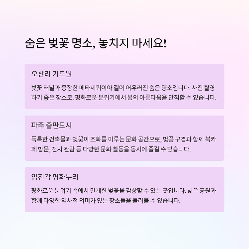 파주의 봄은 다양한 꽃들과 함께하는 캠핑으로 더욱 특별합니다. 특히 벚꽃이 만개하는 4월, 자연 속에서 가족, 연인 또는 친구들과 함께 캠핑을 하며 소중한 추억을 쌓아보세요. 초리포레스트, 배나무꽃캠핑장, 마장호수 캠핑장 등은 각각의 매력을 가지고 있어 원하는 스타일에 맞춰 캠핑을 즐기기에 좋은 장소입니다. 또한 파주의 숨은 벚꽃 명소들도 함께 방문하면 더욱 풍성한 여행이 될 것입니다.