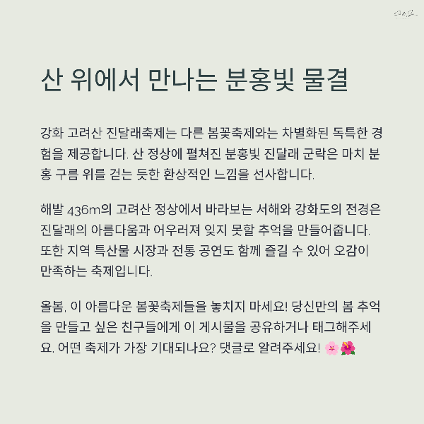 여러분이 가장 가보고 싶은 봄꽃축제는 어디인가요? 방문 경험이 있다면 공유해 주세요! 댓글로 다양한 이야기를 남겨주세요.