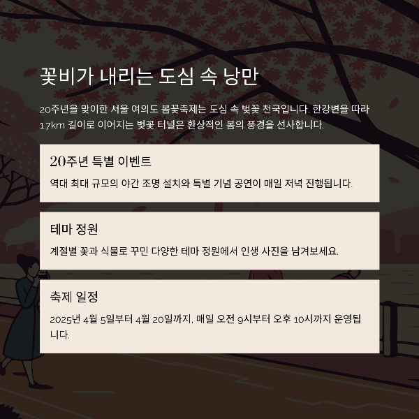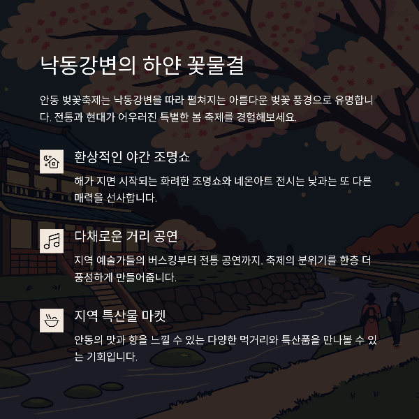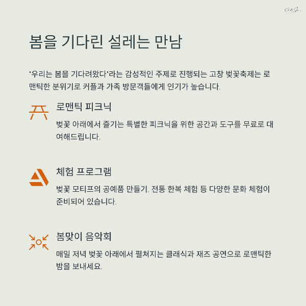 | 여의도, 진해, 안동, 고창, 강화 | 벚꽃길, 피크닉, 야경 명소 | 3월 말~4월 초 방문 추천 |