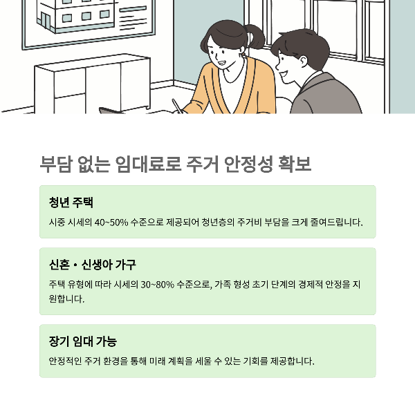 | 시세의 40~50% 임대료, 최대 10년 거주 | 시세의 30~40% 임대료, 최대 20년 거주 | 시세의 70~80% 임대료, 최대 10년 거주 |