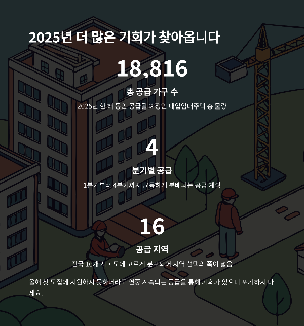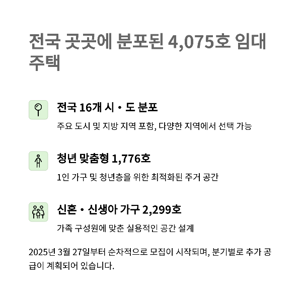 국토교통부는 2025년 3월 27일(목)부터 청년과 신혼·신생아 가구를 위한 올해 첫 매입임대주택 입주자 모집을 시작한다고 밝혔습니다. 이번 공급은 전국 16개 시·도에서 총 4,075호 규모로 진행되며, 청년 1,776호와 신혼·신생아 가구 2,299호로 구성되어 있어 많은 이들의 주거안정을 도울 것으로 기대됩니다. 특히, 신청 접수는 4월 초부터 가능하며, 자격 검증을 거쳐 이르면 6월 말부터 입주가 가능합니다. 수도권부터 지방까지 고르게 배분된 공급 물량은 다양한 지역의 수요를 충족할 것으로 보입니다. 주거지 마련이 어려운 청년과 신혼부부에게 실질적인 도움을 줄 수 있는 기회인 만큼 이번 모집 일정과 조건을 꼼꼼히 살펴보시길 권해드립니다. 아래에서는 모집 개요, 공급 지역, 신청 방법 등 핵심 정보들을 체계적으로 정리해드릴 예정이니 끝까지 확인해보시고 알찬 정보를 챙겨가세요.