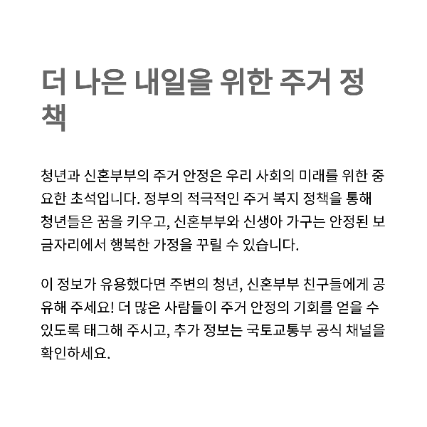 이번 청년 및 신혼·신생아 매입임대주택 모집은 단순한 공급이 아닌, 삶의 안정과 새로운 출발을 위한 정부의 깊은 의지를 담고 있습니다. 특히 자녀 양육 환경을 고려한 우선순위 적용과 소득 기준을 다양화한 공급 구조는 실수요자의 상황에 맞춘 유연한 지원책으로 평가됩니다. 단순한 집이 아닌, 삶을 시작하는 공간을 마련해주는 이 정책이 더 많은 이들의 삶을 변화시킬 수 있도록, 신청 전 조건과 일정을 꼼꼼히 확인하신 후 적극적으로 활용해보시길 바랍니다.