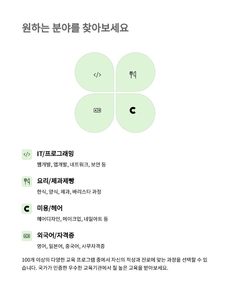 훈련비 및 훈련장려금 지원 다양한 분야의 강좌 제공 |