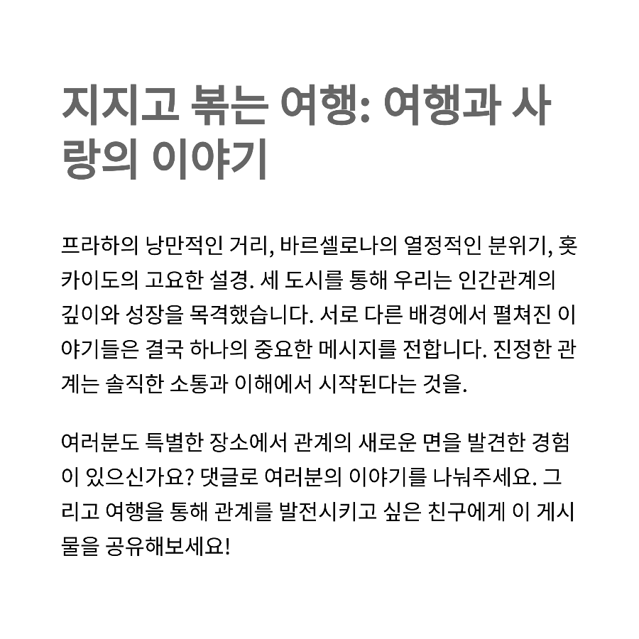 지금까지 SBS Plus와 ENA의 인기 리얼리티 프로그램 '지지고 볶는 여행 5회'에 대한 리뷰와 주요 관전 포인트를 정리해 드렸습니다. 이번 회차는 출연진들이 프라하, 바르셀로나, 홋카이도를 여행하며 관계의 갈등과 화해를 경험하고, 서로에 대한 솔직한 감정을 드러내며 새로운 시작을 모색하는 모습을 감동적으로 그려냈습니다. 아름다운 여행지의 풍경과 함께 출연진들의 진솔한 감정 표현이 어우러져 시청자들에게 큰 공감을 주었는데요. 앞으로의 방송에서도 이들이 보여줄 다양한 감정 변화와 새로운 관계 설정이 기대됩니다. 다음 회차도 놓치지 말고 함께 시청해 보세요!