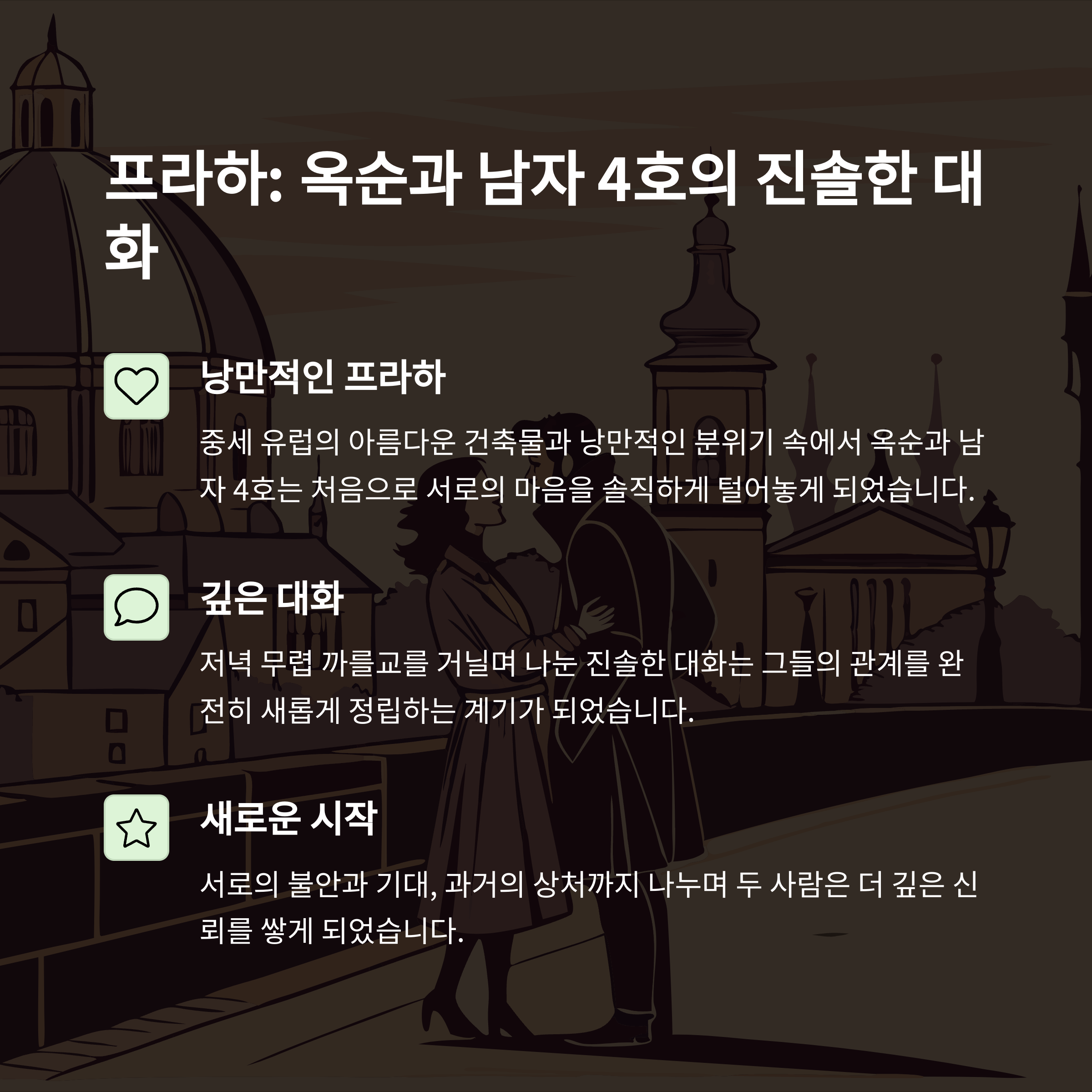 특히 9기 옥순과 남자 4호는 과거의 어색함을 극복하고 프라하에서의 진솔한 대화를 통해 관계를 다시 정리하며 시청자들에게 큰 인상을 남겼습니다.