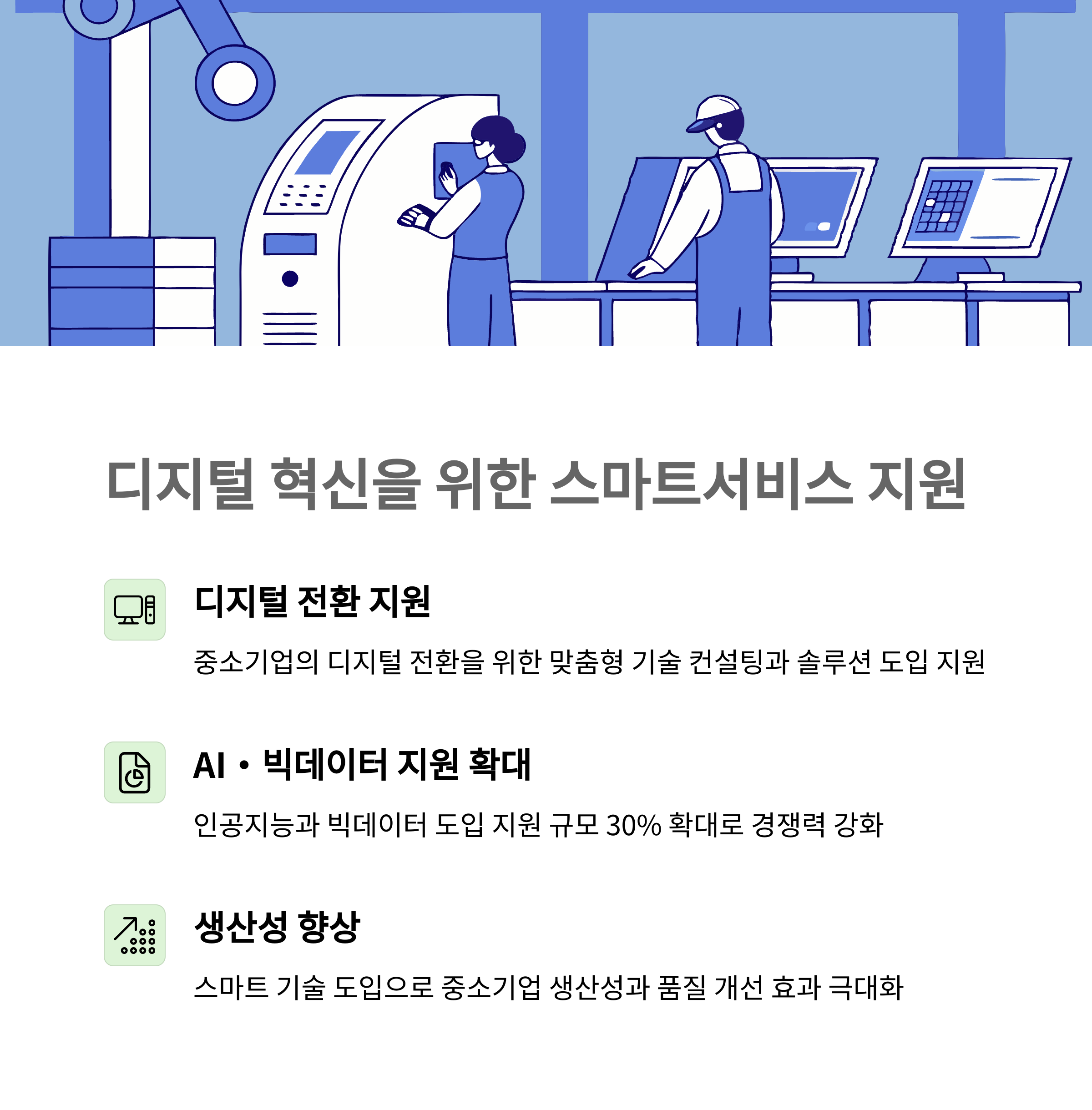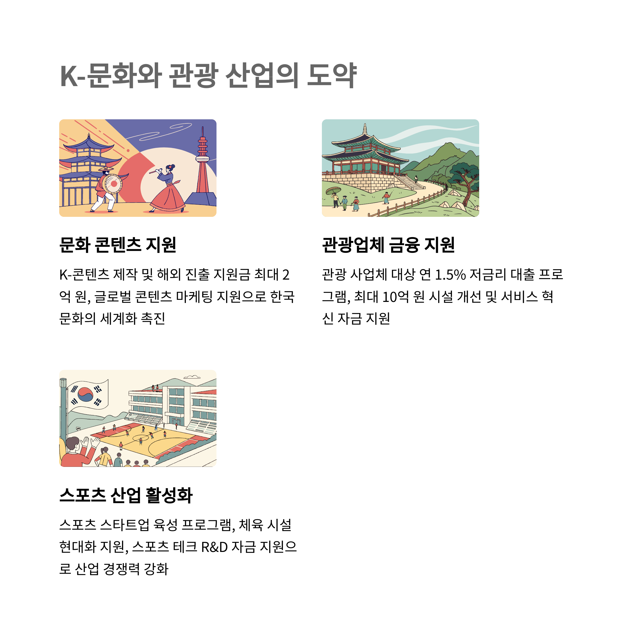 | 스마트서비스 지원사업, 혁신바우처, 스마트공방 사업 | 수출바우처, 외국인 투자 촉진 | 관광업 특별 대출, 스포츠 산업 지원, 지역 문화 활성화 |