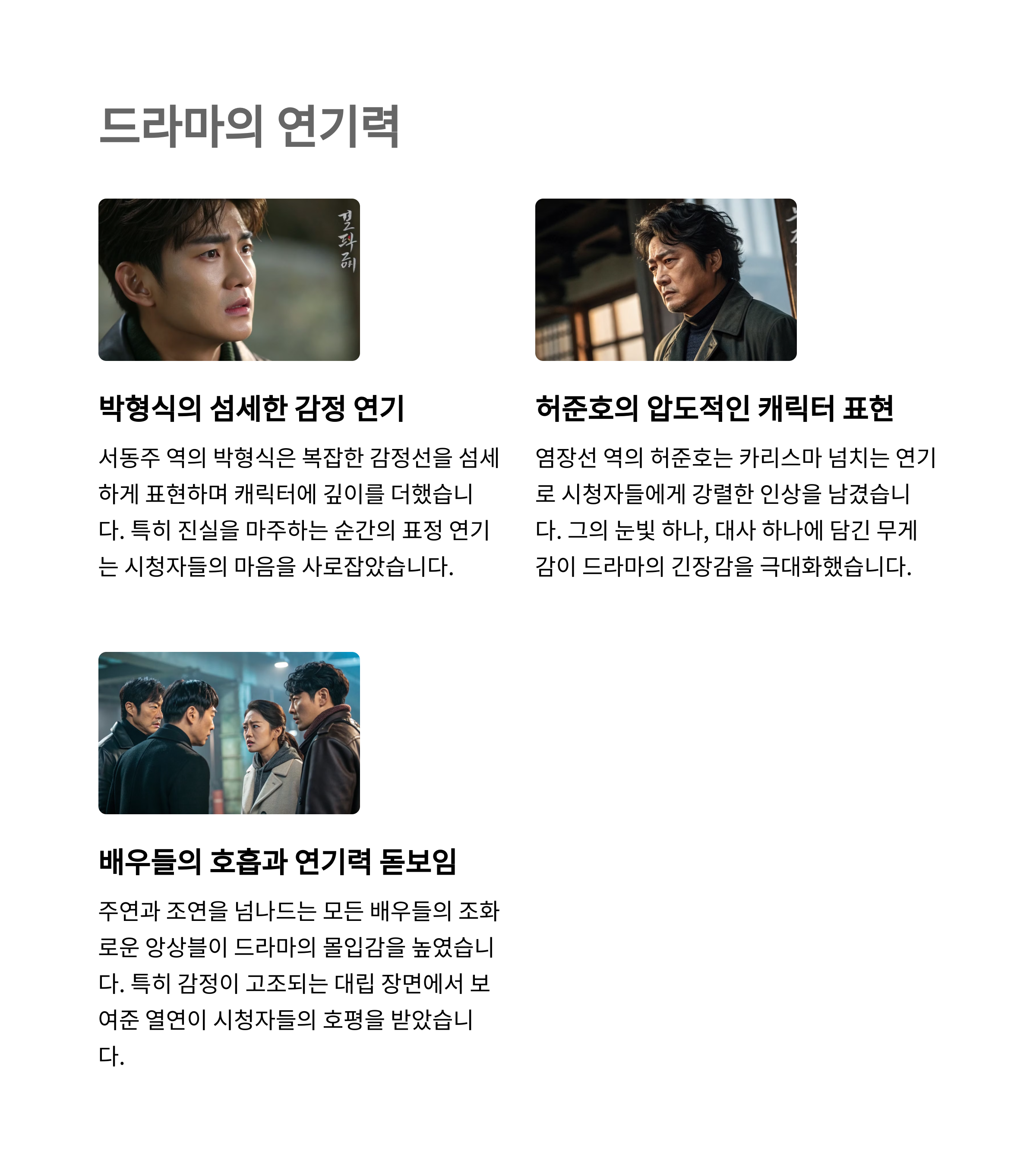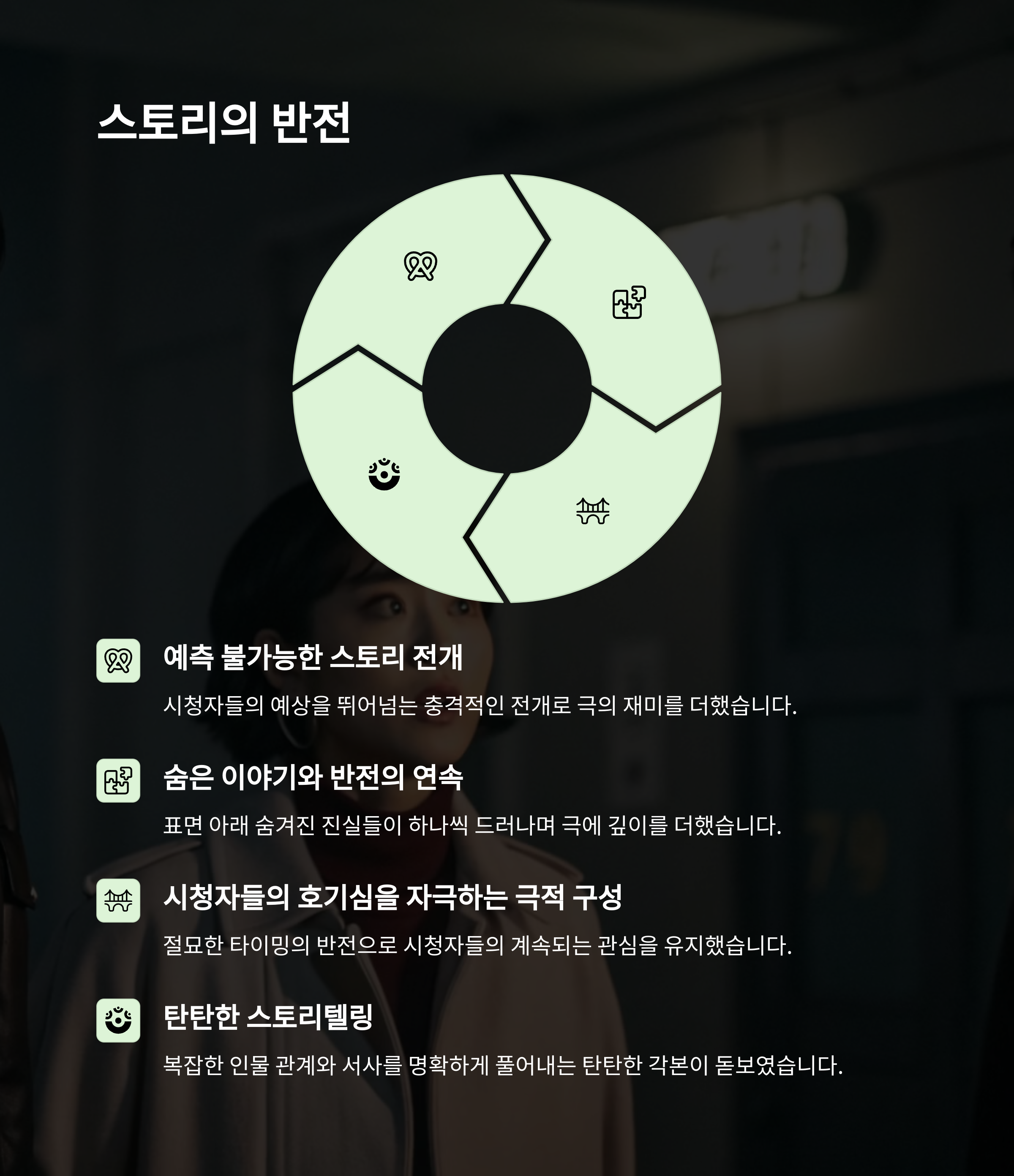 탄탄한 스토리 구성, 배우들의 강렬한 연기, 끊임없는 반전으로 몰입감을 유지하는 점이 가장 큰 강점입니다.
