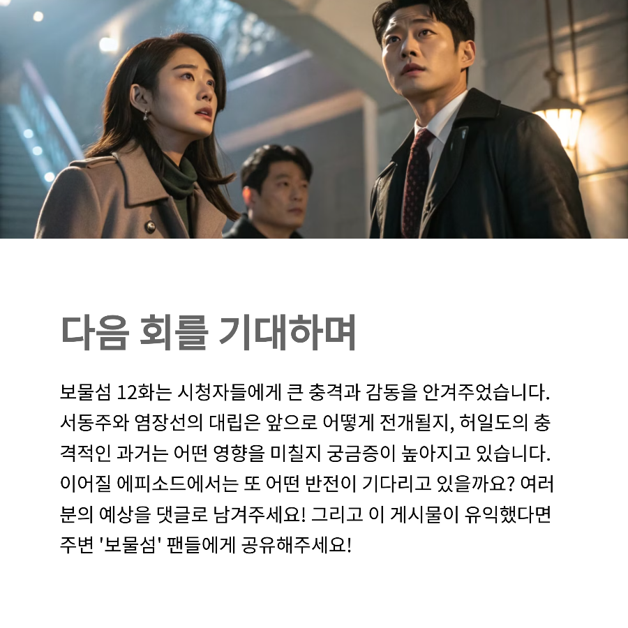 보물섬 12화를 보고 나니, 그냥 드라마가 아니라 감정의 롤러코스터를 제대로 탄 느낌이에요. 특히 복수라는 테마를 이렇게까지 몰입도 있게 풀어낸 건 진짜 오랜만이었거든요. 여러분도 보셨다면, 어떤 장면이 가장 기억에 남으셨나요? 댓글로 여러분의 생각도 공유해주세요! 우리, 다음화도 함께 기대하면서 기다려봐요. 또 이야기 나눠요 :)