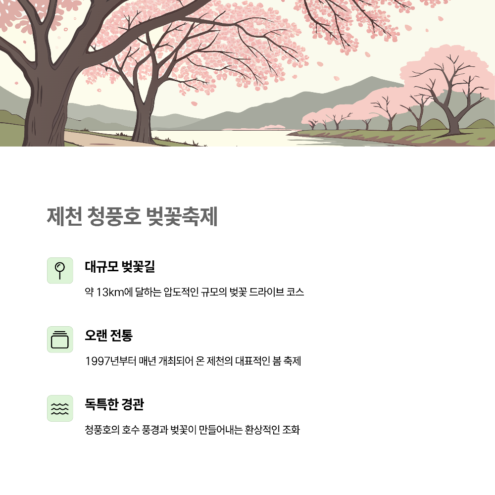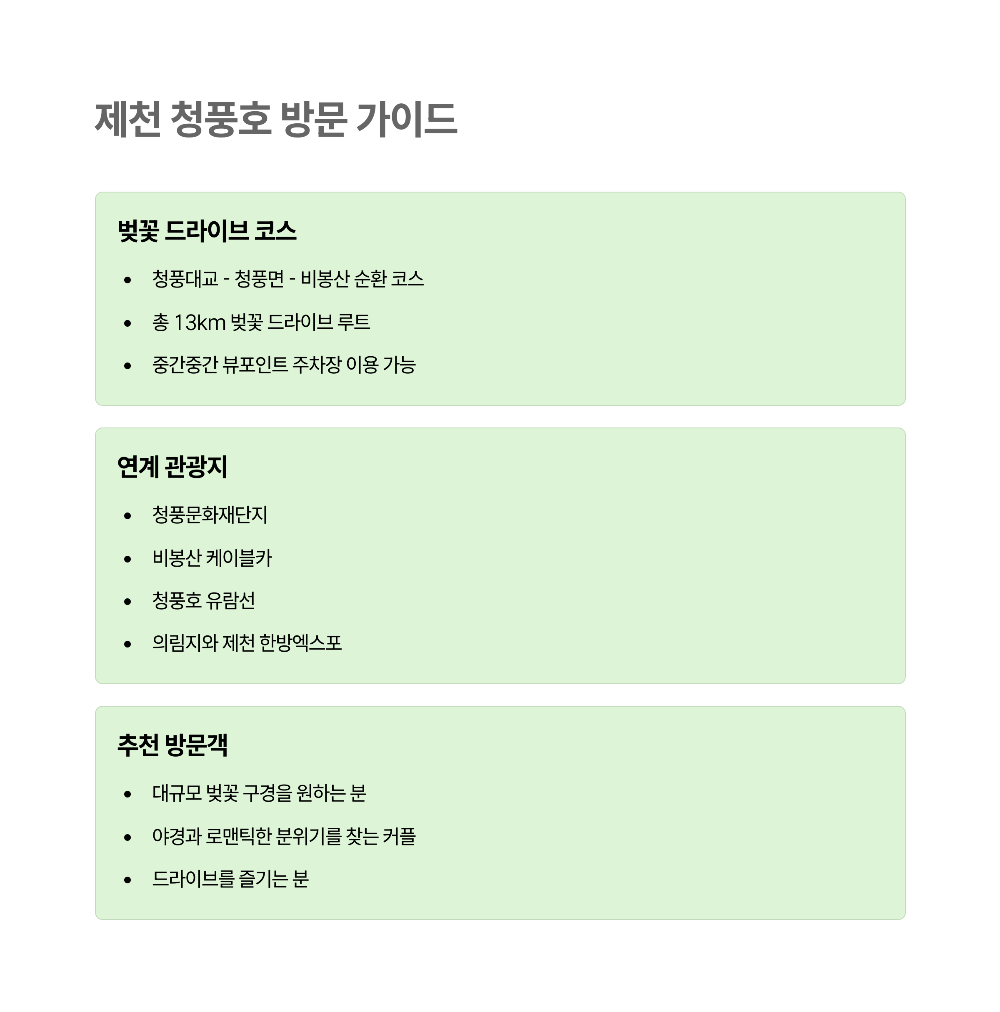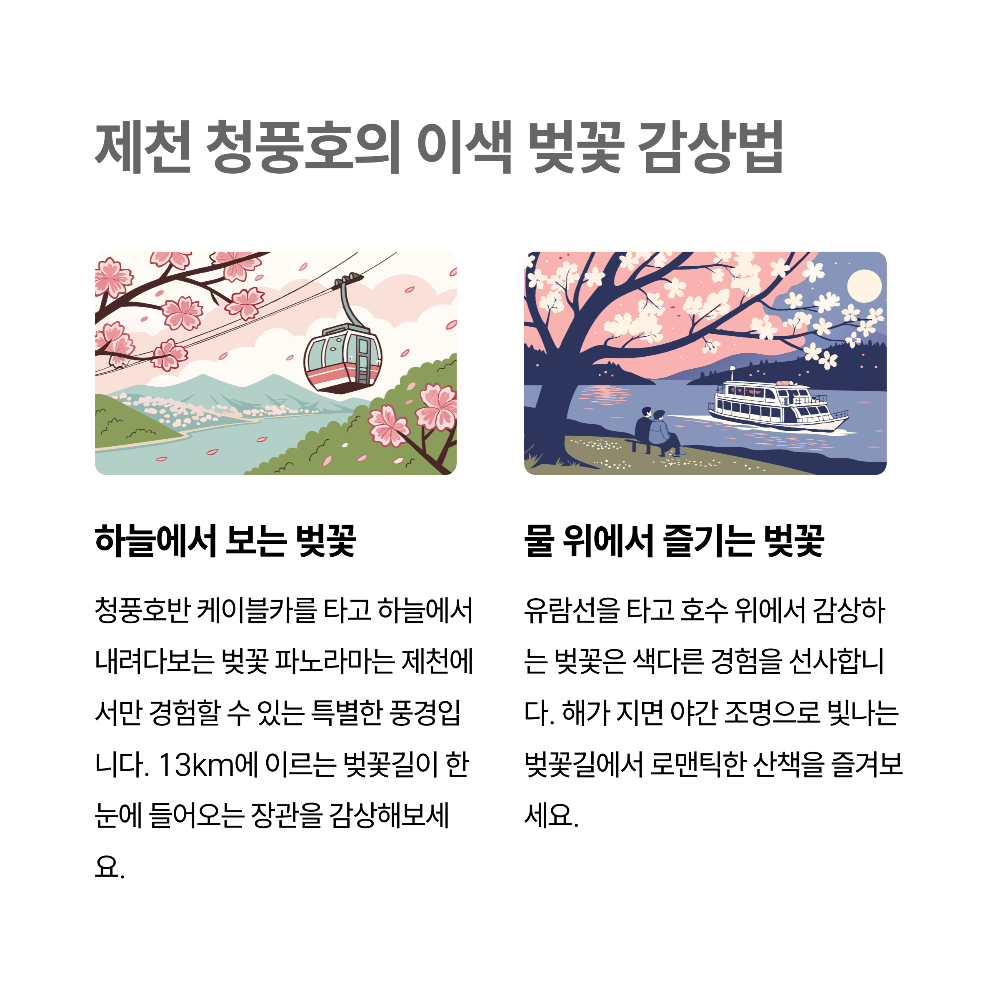 - 💑 커플 데이트라면? 👉 청풍호 벚꽃축제 (케이블카 + 야경 + 호수뷰 감성)