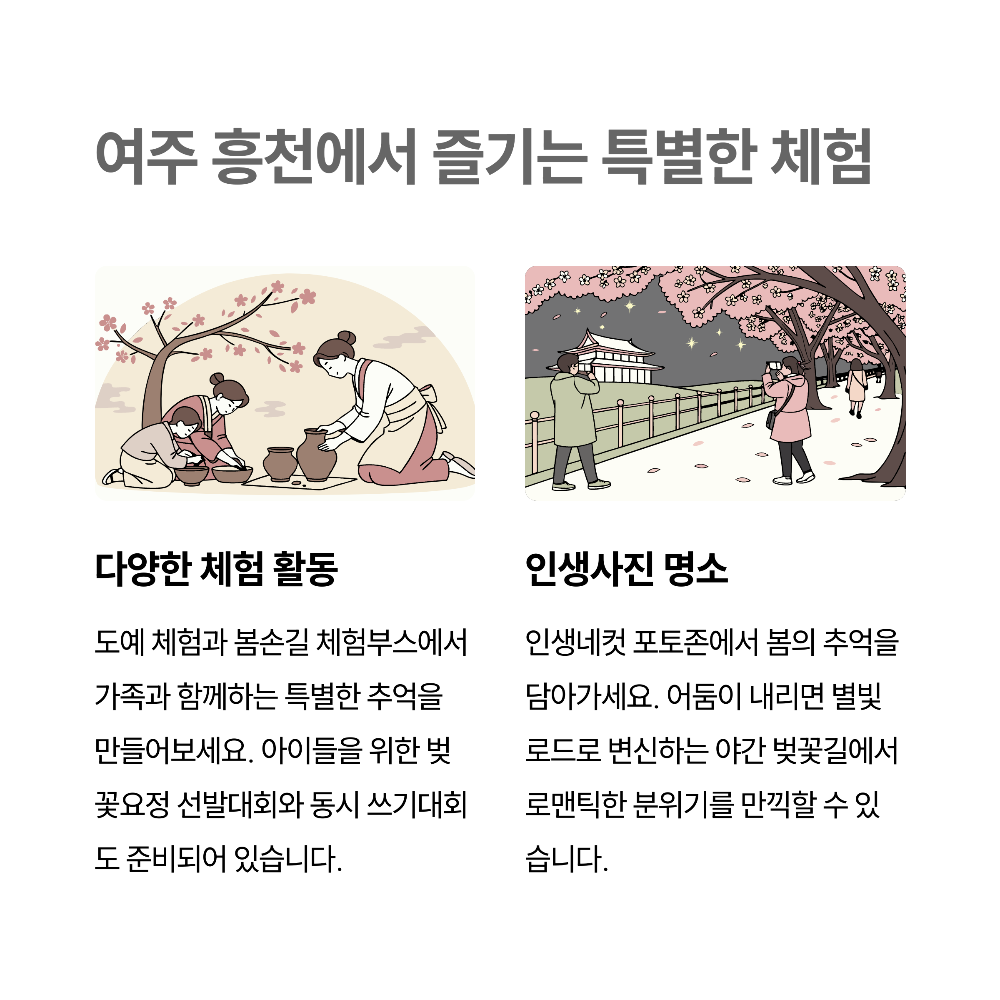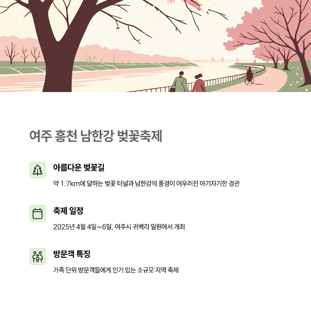 여주의 봄은 남한강 벚꽃길과 함께 시작됩니다. 약 1.7km의 벚꽃 테마 로드를 따라 포토존과 체험 프로그램이 빼곡히 들어선 이 축제는, 조용하고 아기자기한 벚꽃산책에 딱이에요.