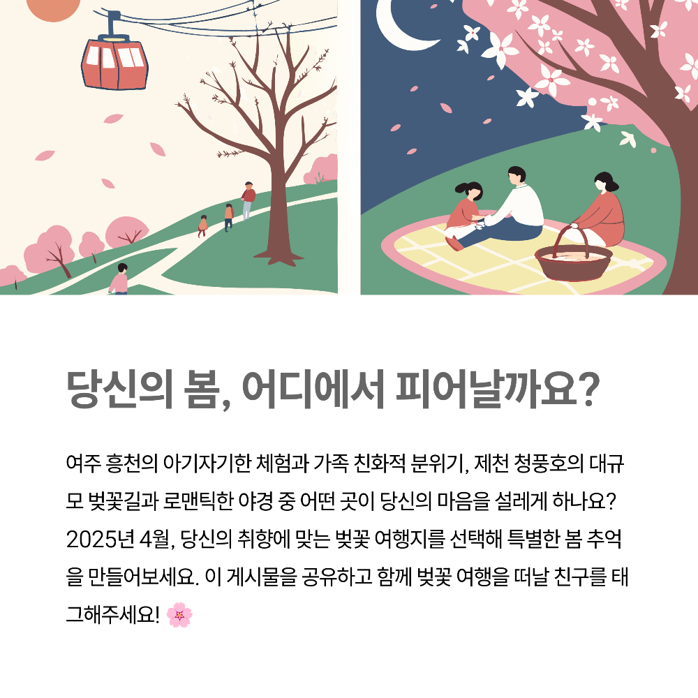 올봄 어디에서 벚꽃을 맞이하실 건가요? 🌸 잔잔한 남한강을 따라 걷고 싶다면 여주, 드라마 같은 호수 풍경과 야경을 원한다면 청풍호! 어느 곳이든 카메라만 들면 인생샷은 기본이니, 가장 나다운 벚꽃길을 선택해보세요. 이번 봄, 여러분의 벚꽃도 활짝 피길 바랍니다 😊
