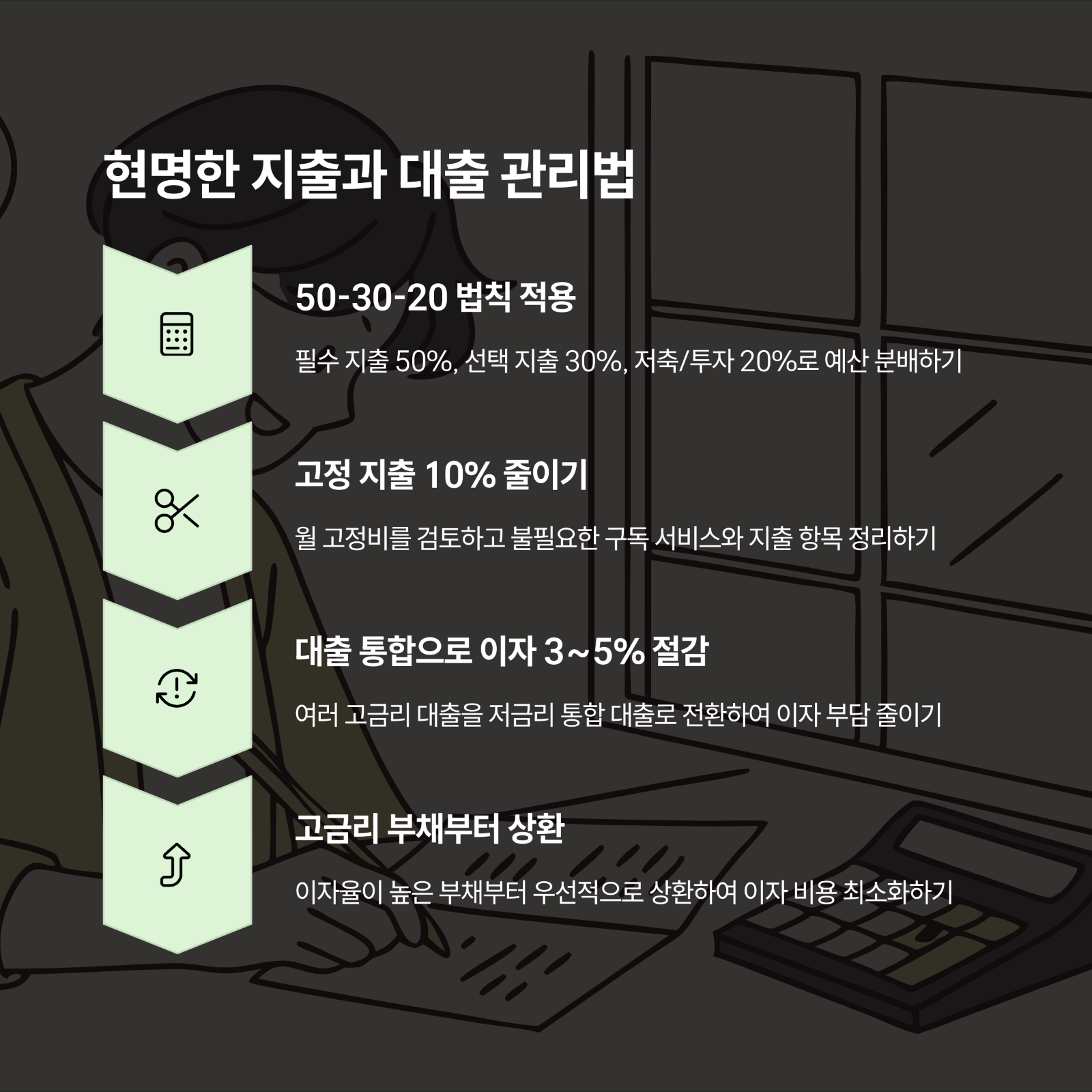- ✔️ 부채 비율 관리: 월 소득 대비 30% 이하 유지