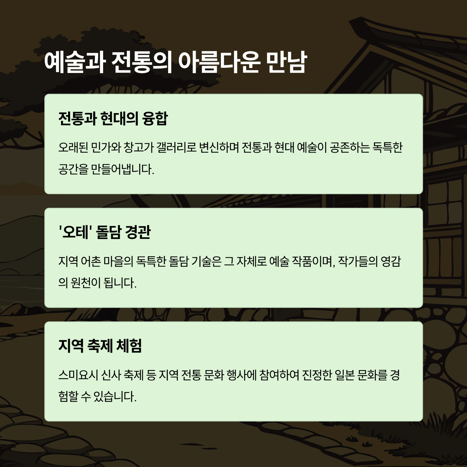 - 예술을 통한 지방 활성화의 대표 사례로, 전 세계 예술 관계자들의 벤치마크가 되고 있어요.