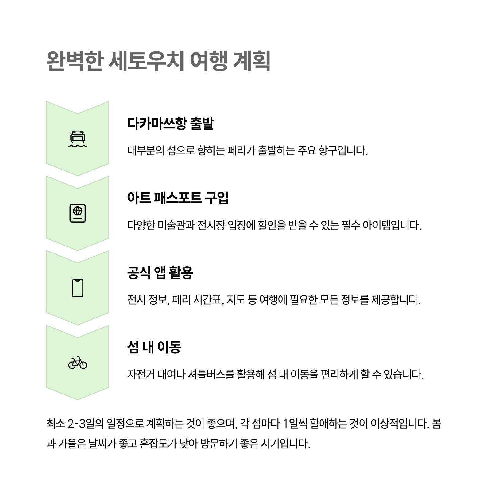 - ⛴️ 페리 예약: 섬 간 이동은 반드시 미리 계획해야 원활