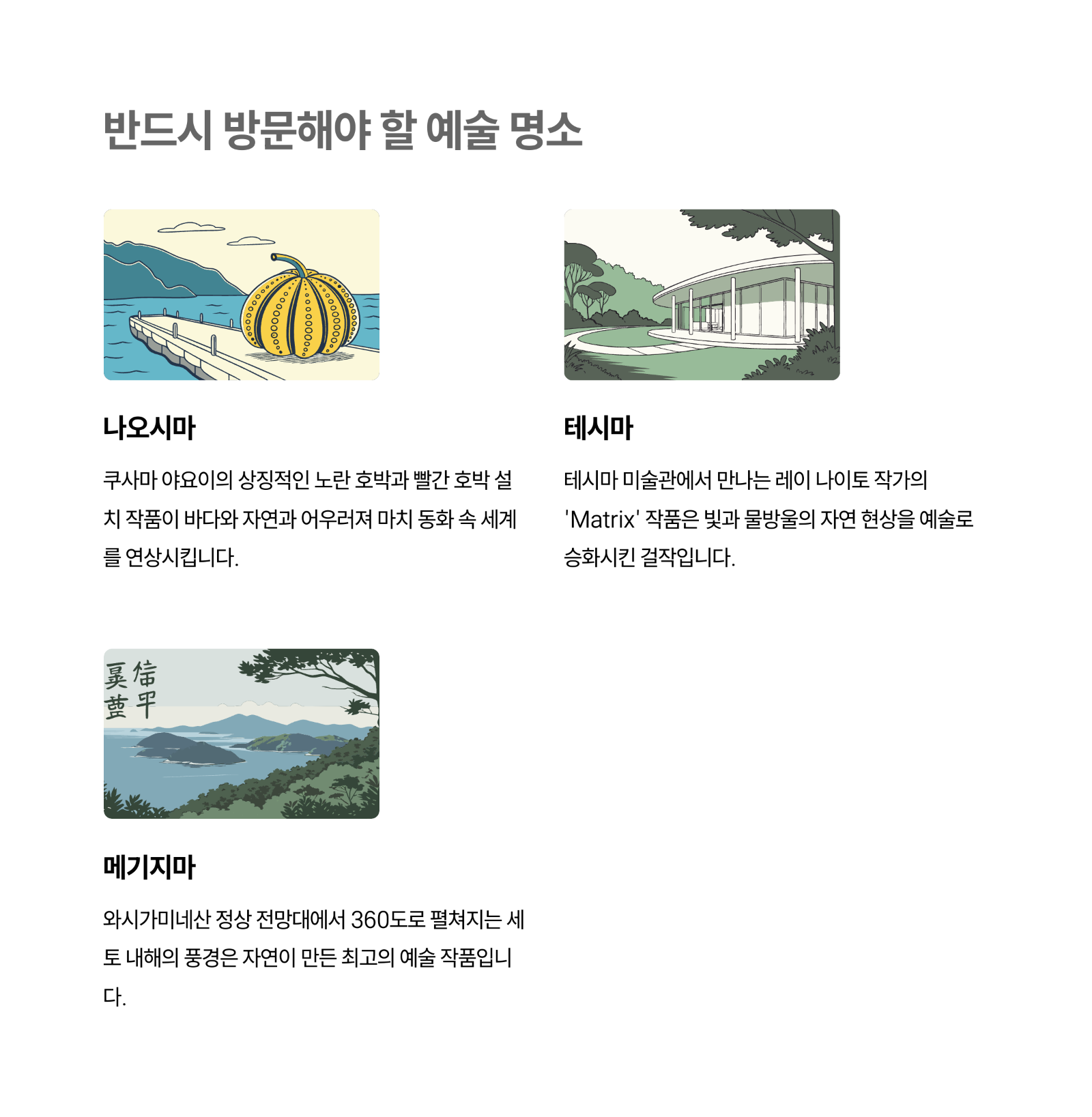 - 🎨 치추 미술관, 베네세 하우스, 야요이 쿠사마의 호박 설치물 등으로 유명