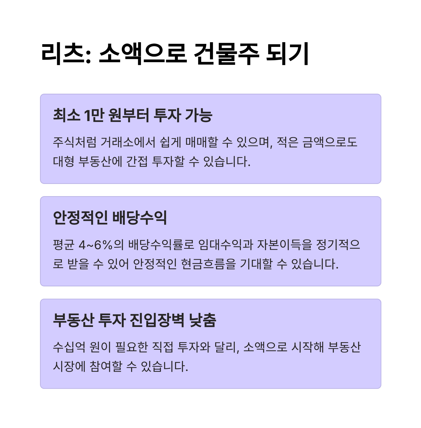 - 장점: 부동산 직접 구입 없이도 안정적 배당 수익 가능