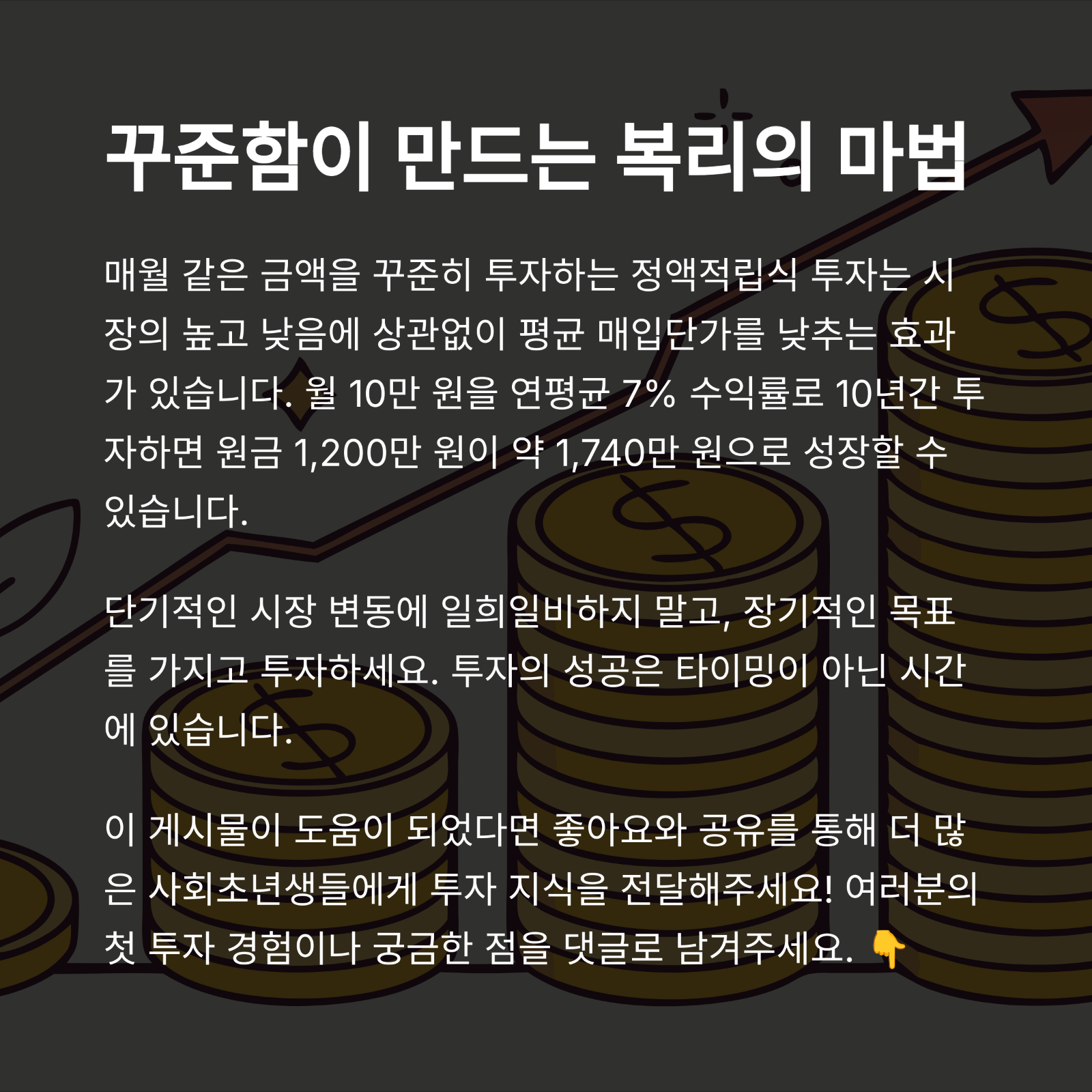 - 투자 예시: 월 10만 원 적립식 매수로 꾸준히 쌓기
